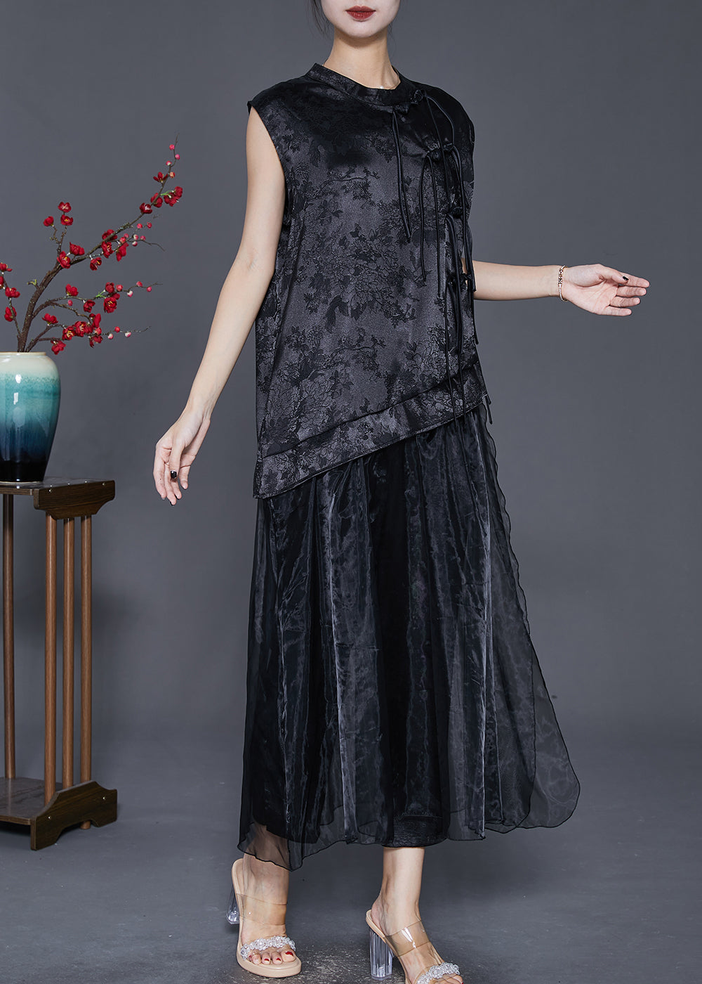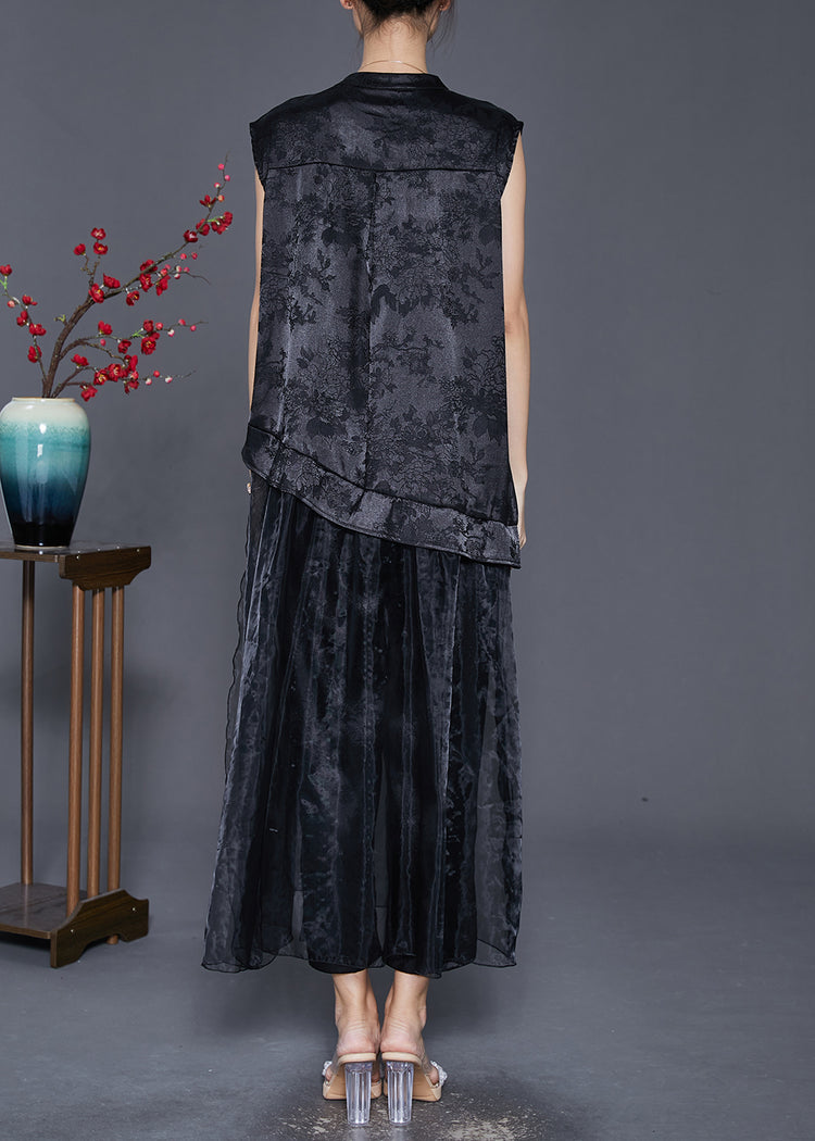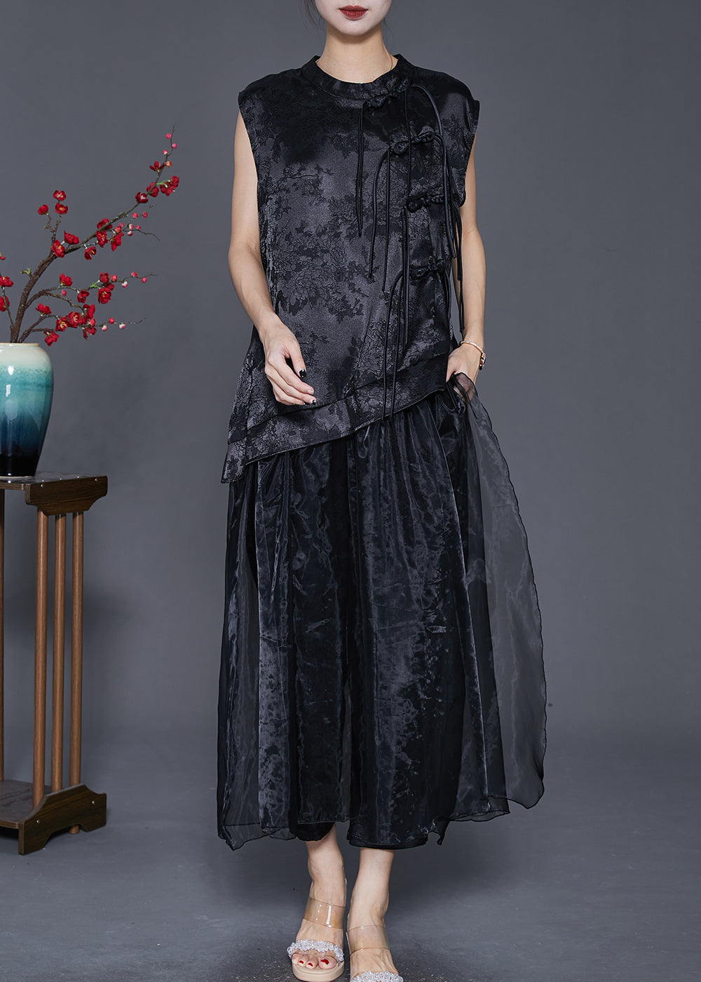 Vintage Black Asymmetrical Jacquard Silk Two Piece Set Fall