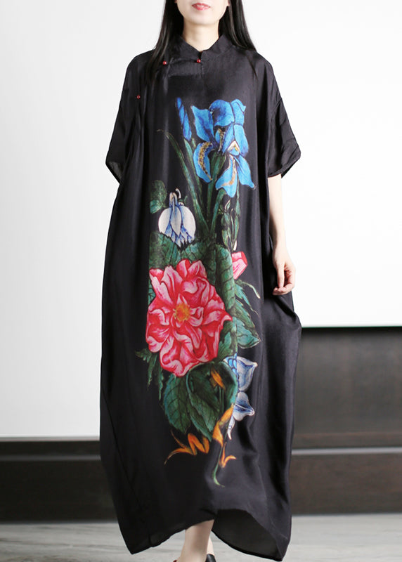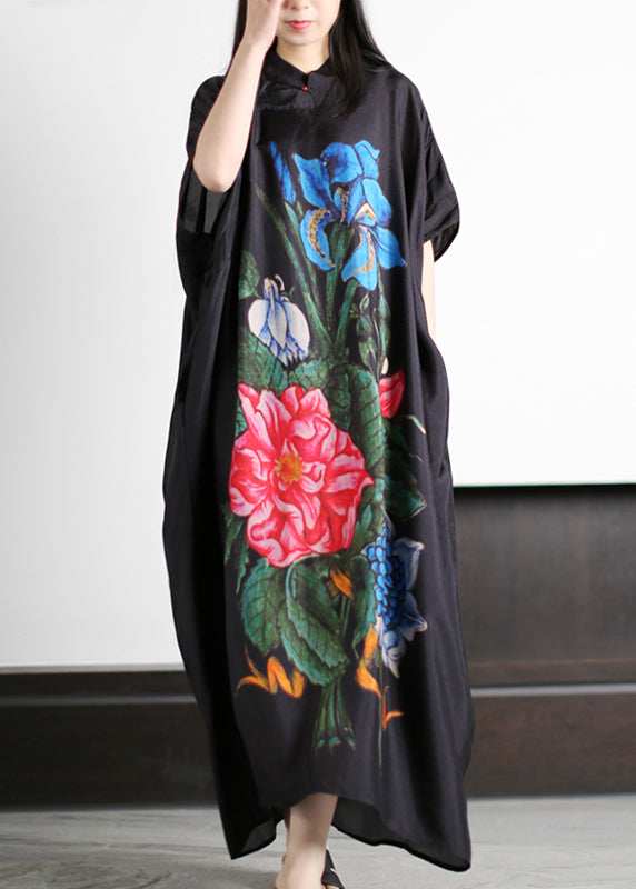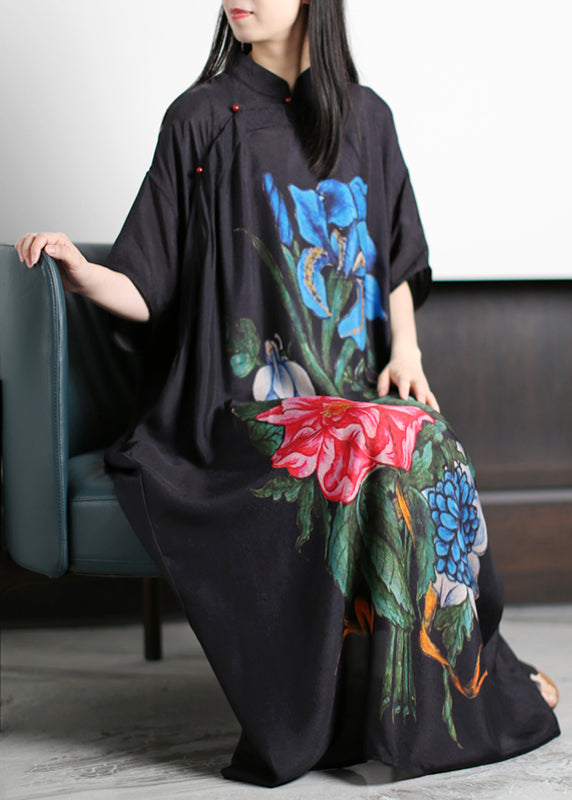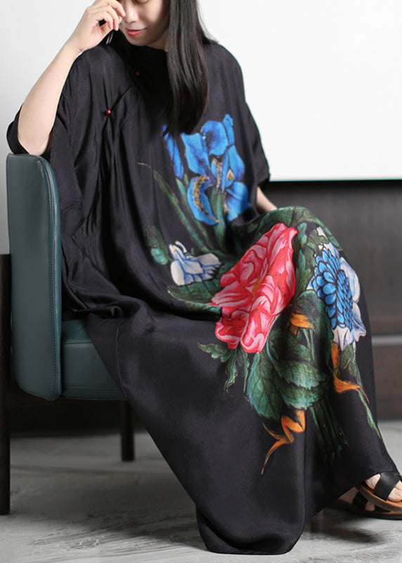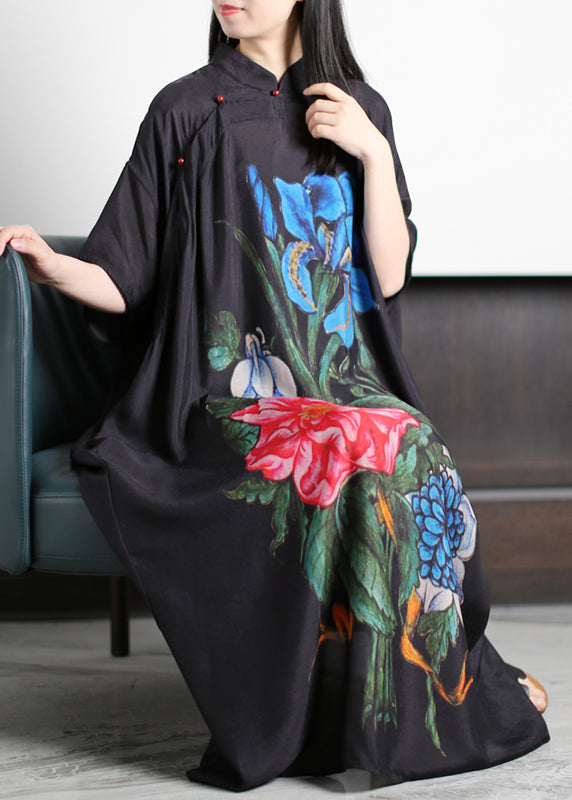 Vintage Black Stand Collar Asymmetrical Blue Print Silk Loose Dress Batwing Sleeve