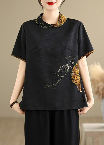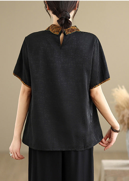 Vintage Black Stand Collar Embroidered Silk Shirt Top Summer