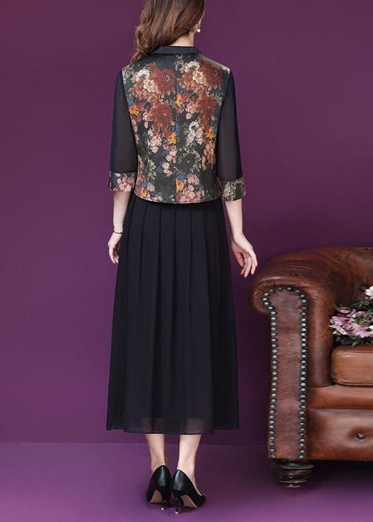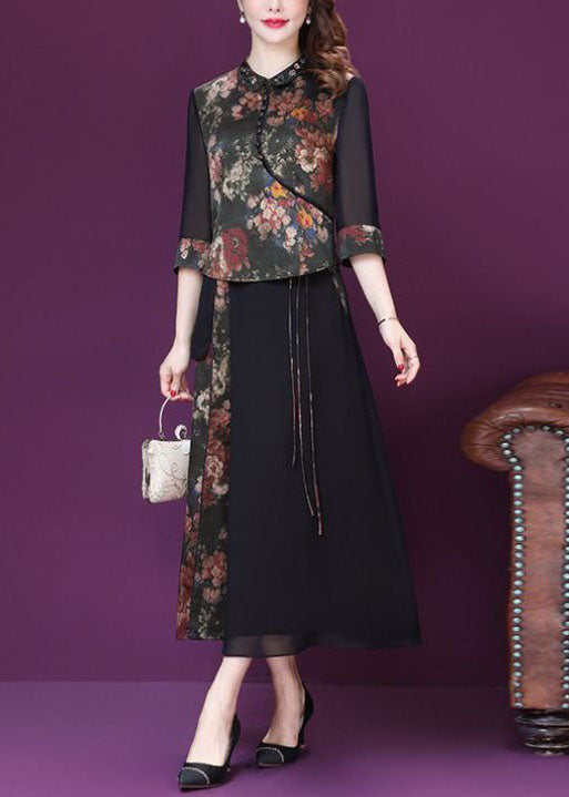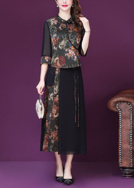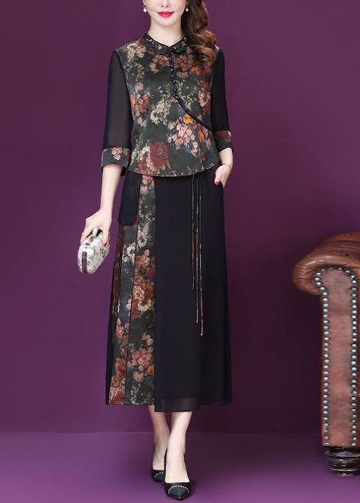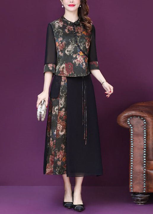 Vintage Black Stand Collar Print Silk Two Piece Set Women Clothing Spring