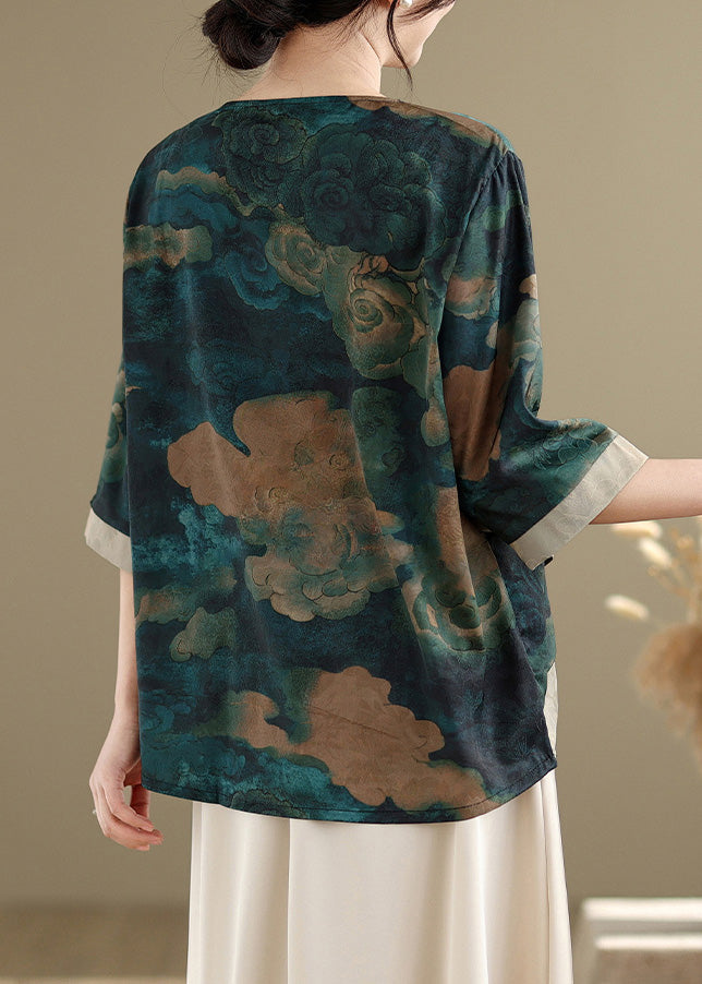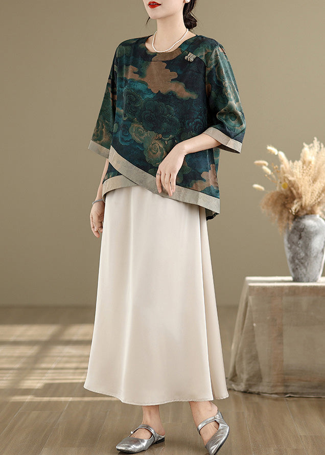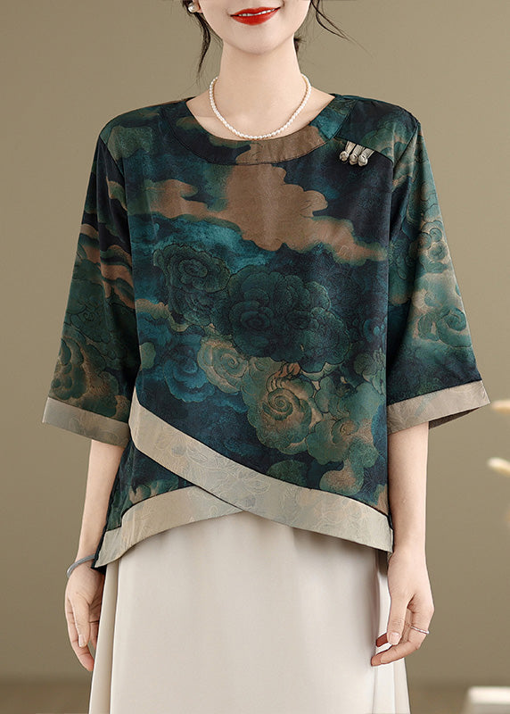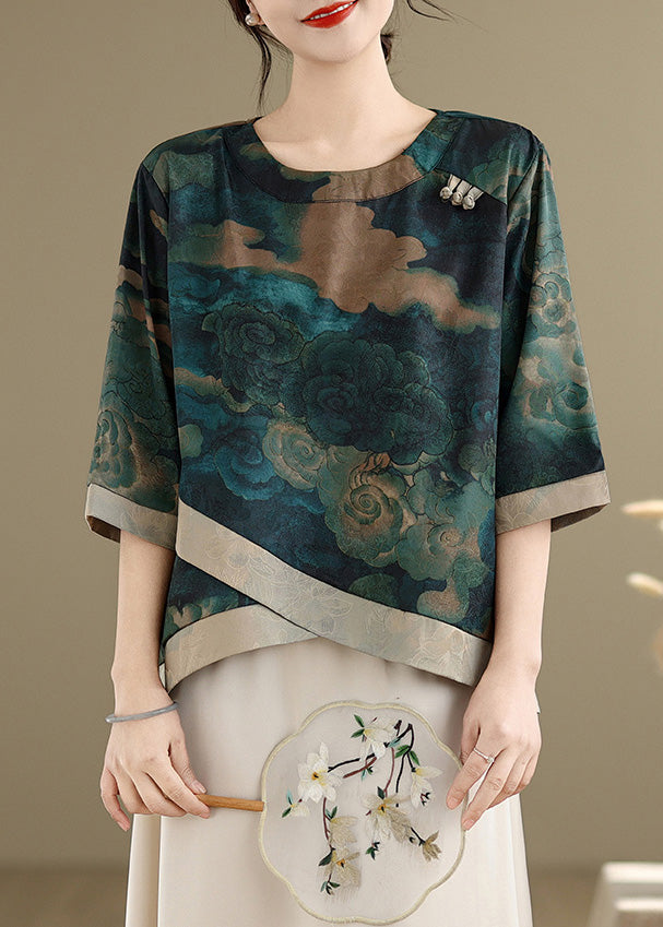 Vintage Green Asymmetrical Print Silk Blouses Half Sleeve