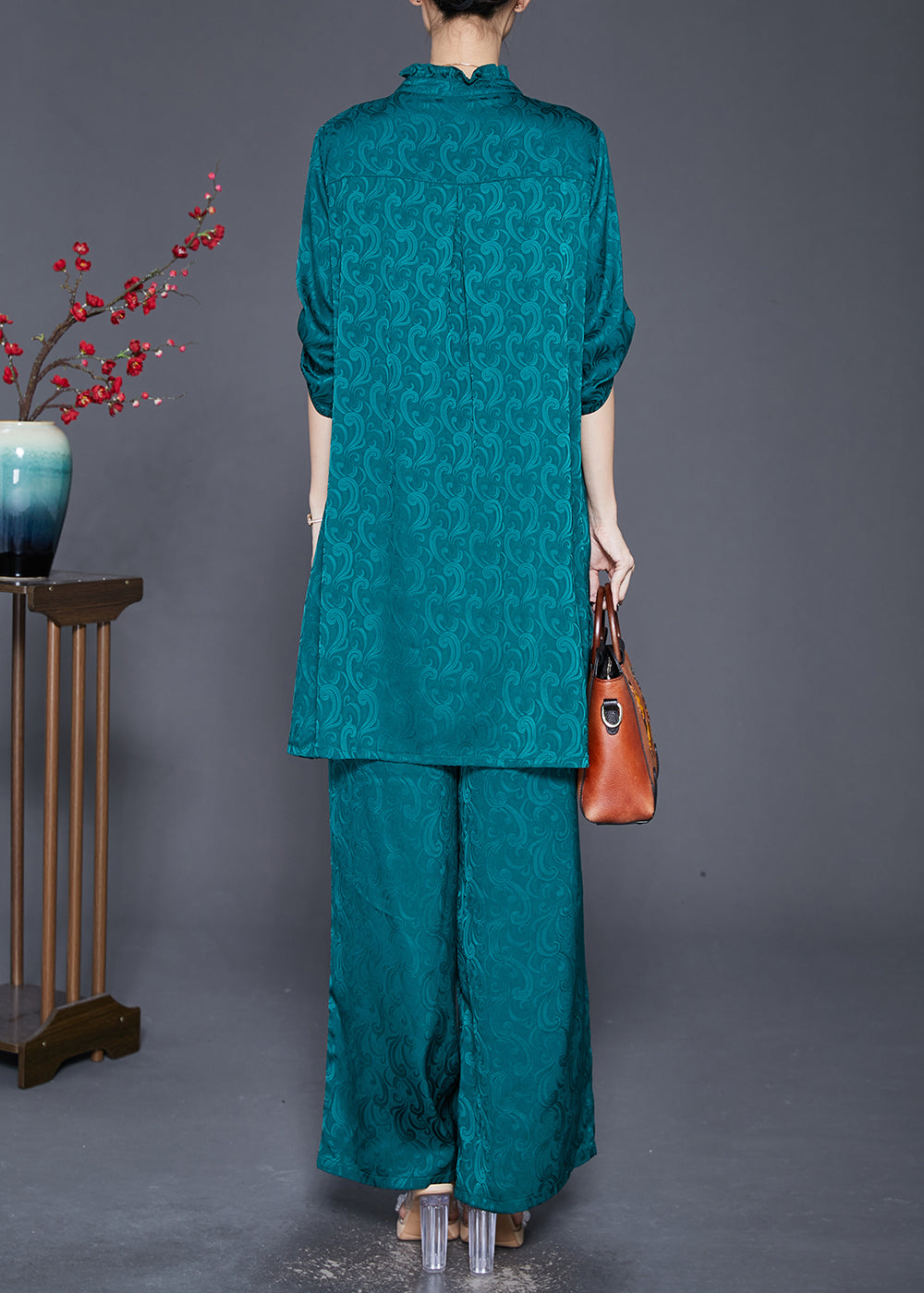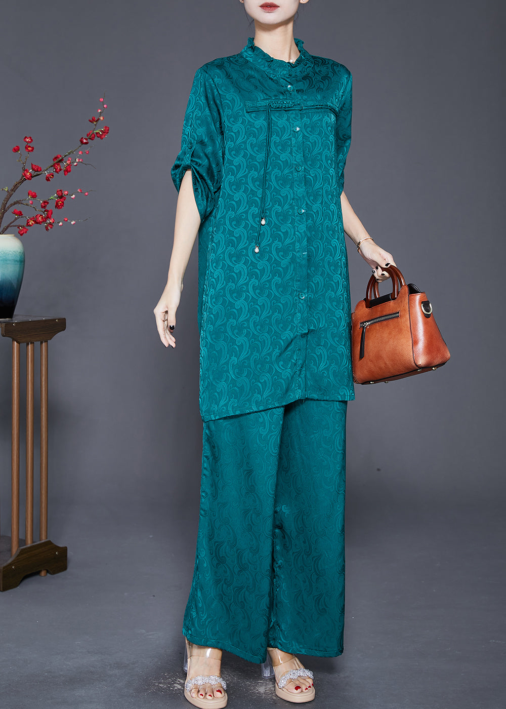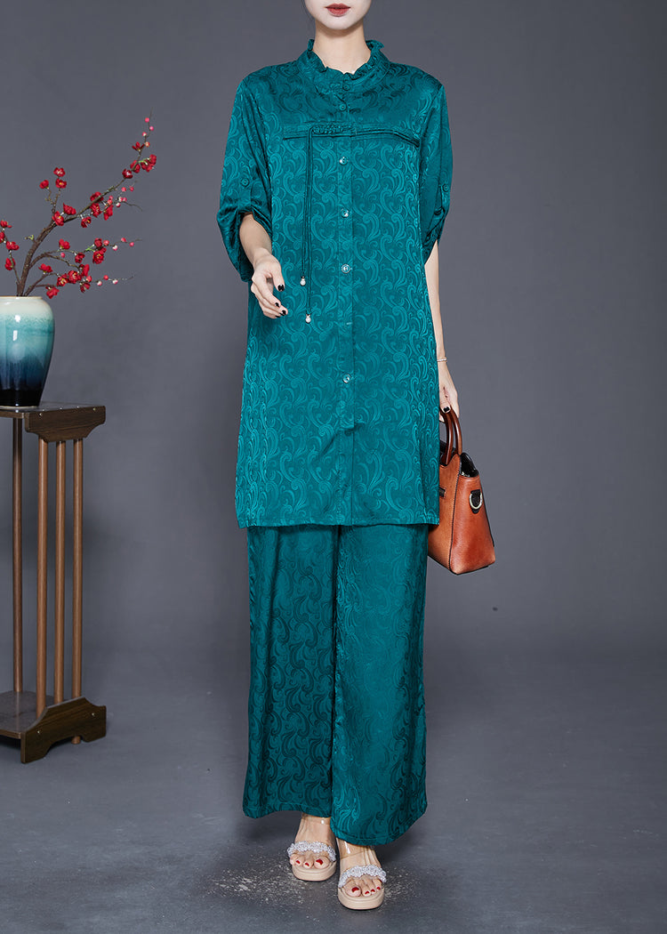 Vintage Green Ruffled Tasseled Silk Women Sets 2 Pieces Fall