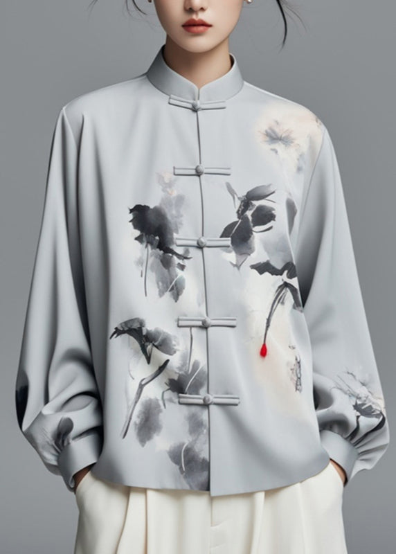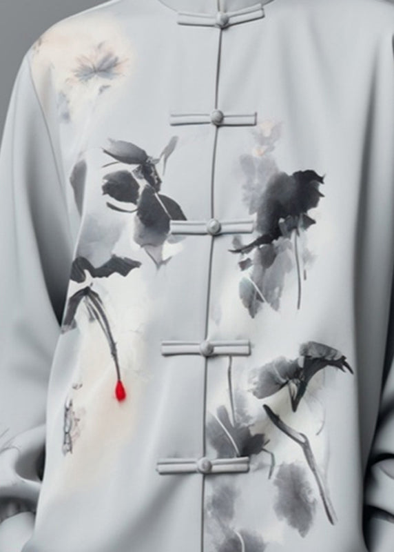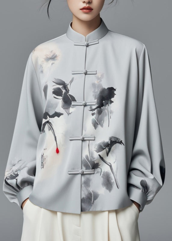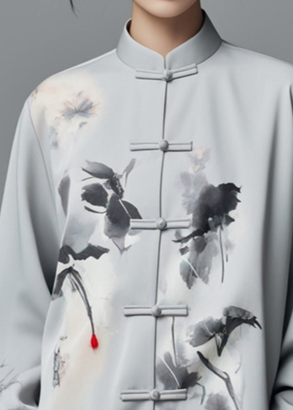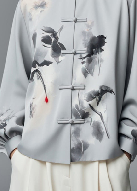 Vintage Grey Tie Dye Button Silk Cotton Coats Lantern Sleeve