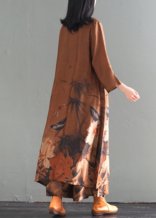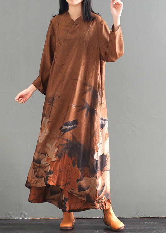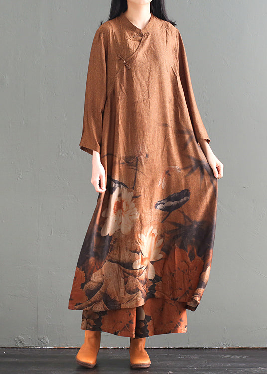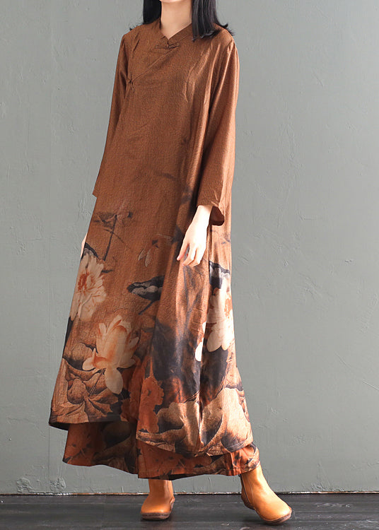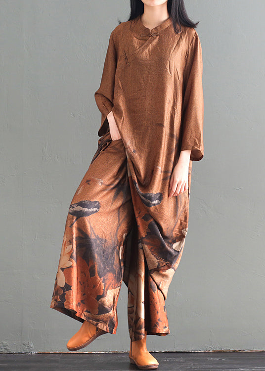 Vintage Khaki Print Chinese Button Silk Two Piece Set Women Clothing Fall