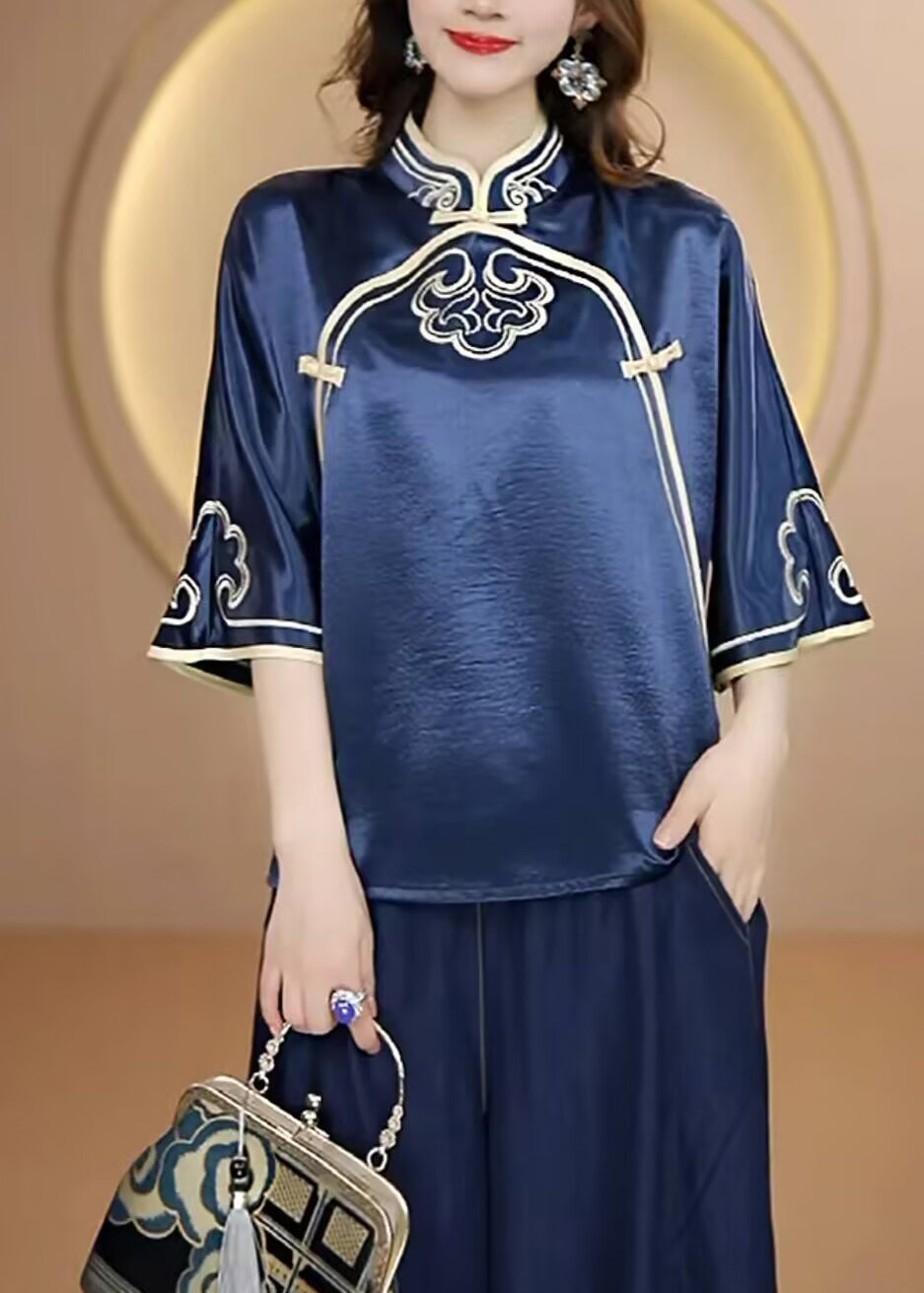 Vintage Navy Stand Collar Embroidered Silk Top Flare Sleeve
