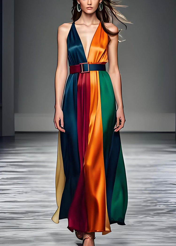 Women Colorblock V Neck Tie Waist Silk Long Dress Sleeveless