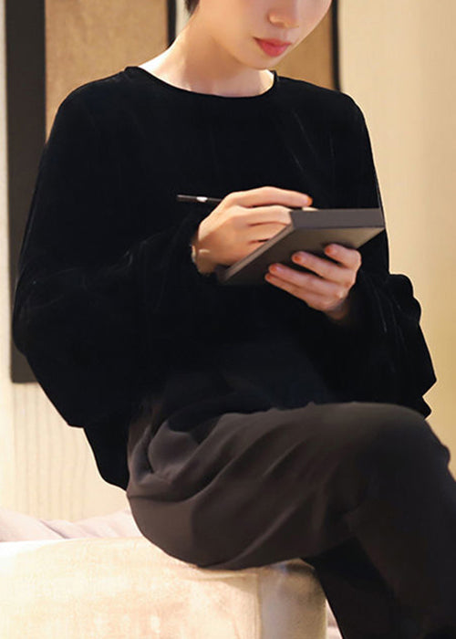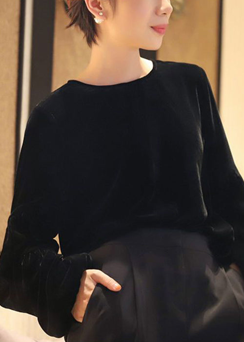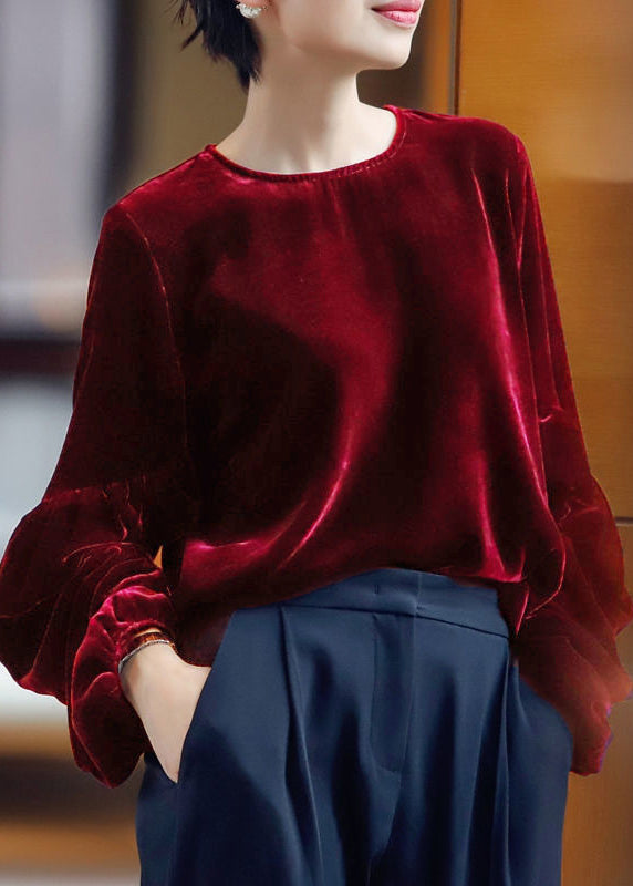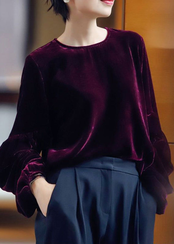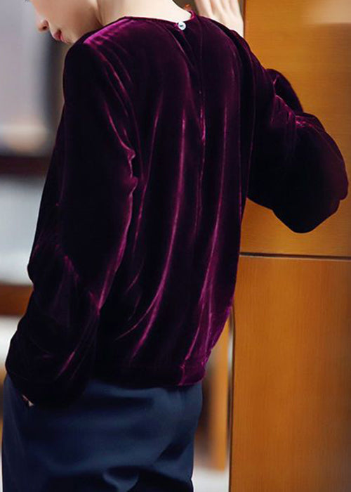 Women Purple O Neck Solid Silk Velour Tops Spring