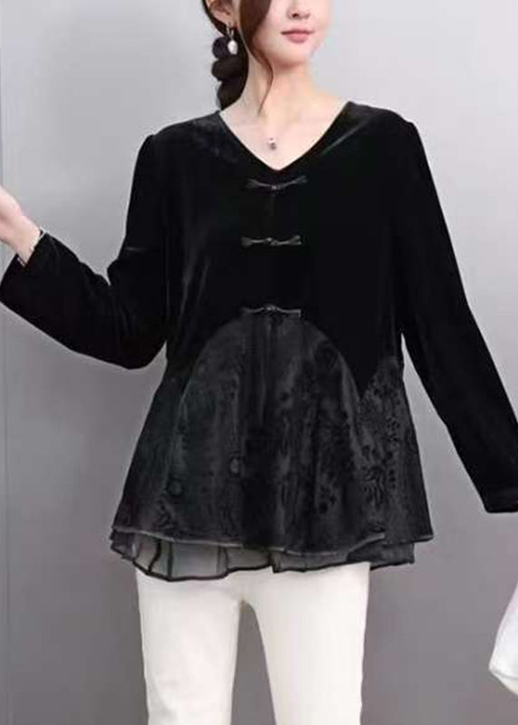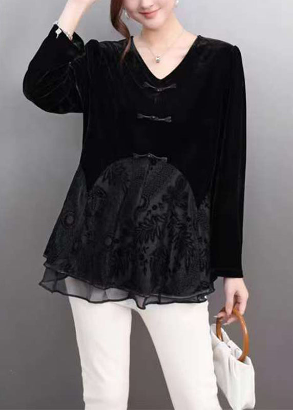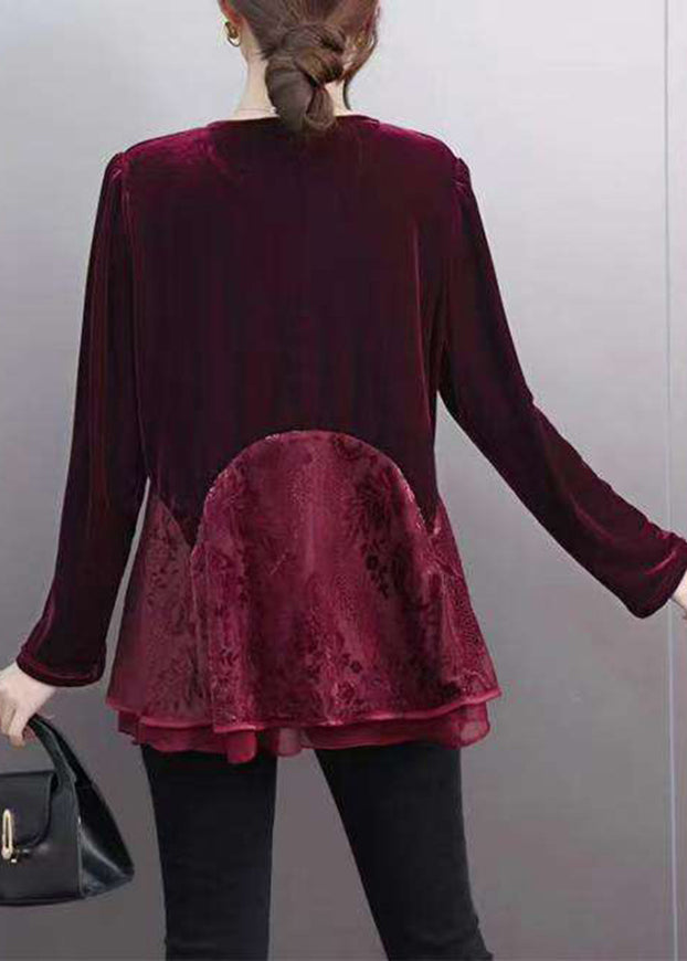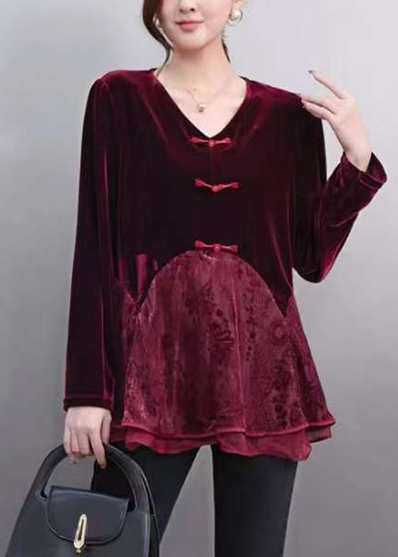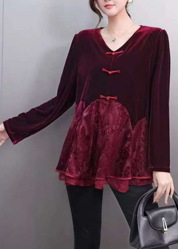 Women Red V Neck Lace Patchwork Silk Velour Top Spring