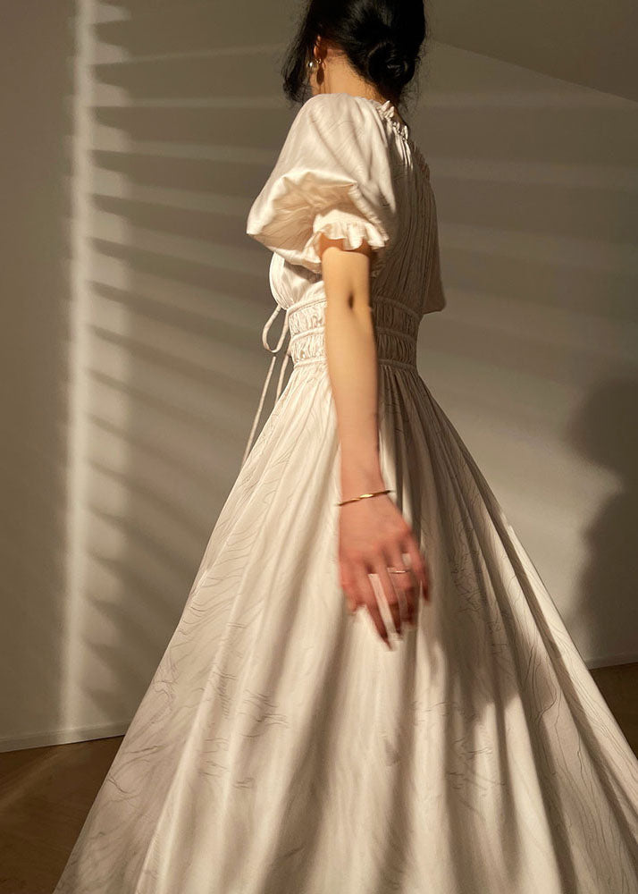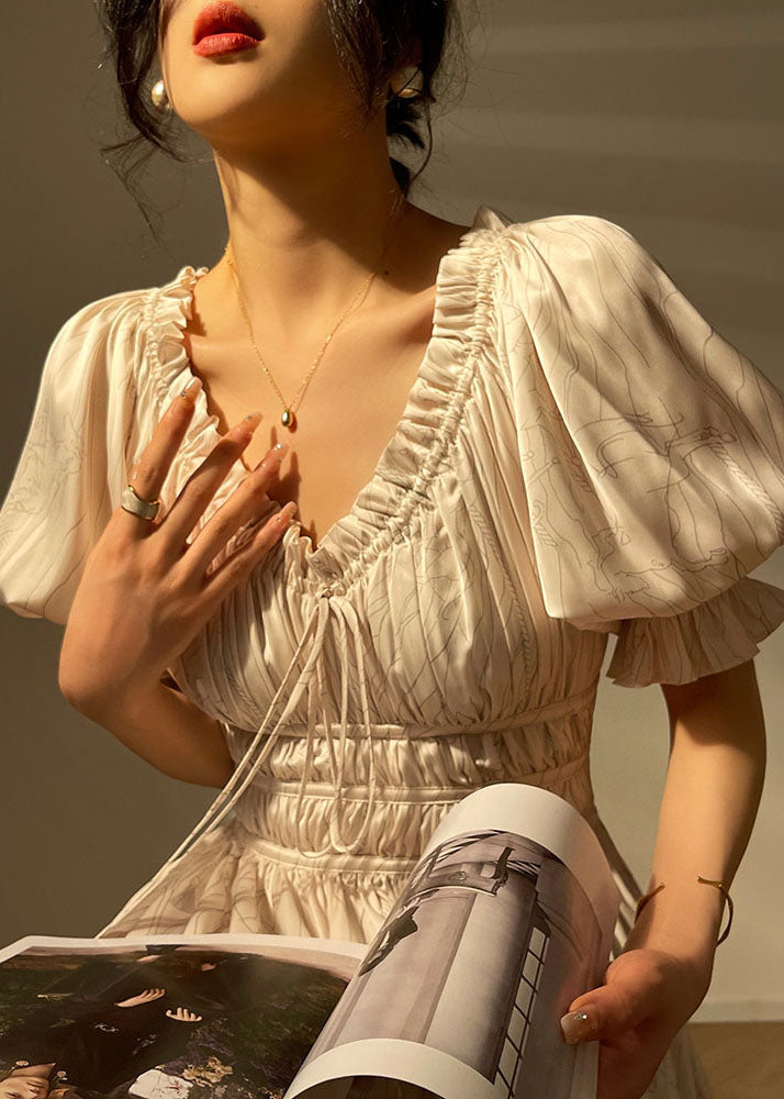 Women White V Neck Wrinkled Print Silk Maxi Dresses Summer