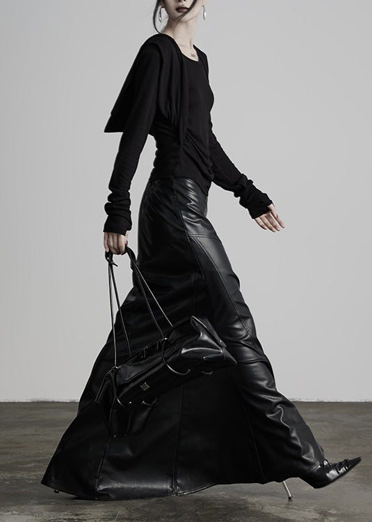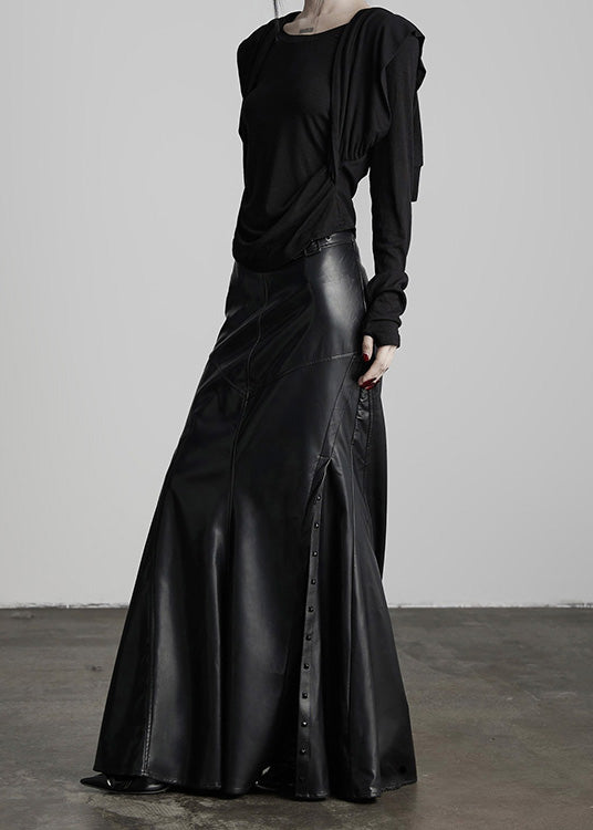 Italian Black Rivet High Waist Patchwork Faux Leather Skirts Winter