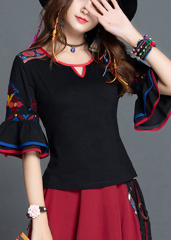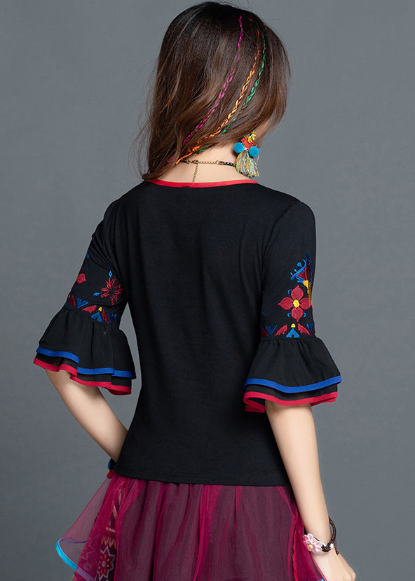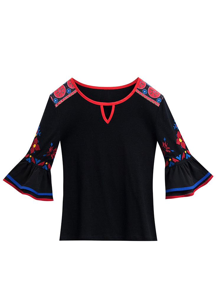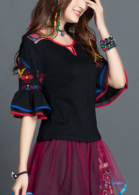 Slim Fit Black Embroideried Patchwork Cotton Top Flare Sleeve