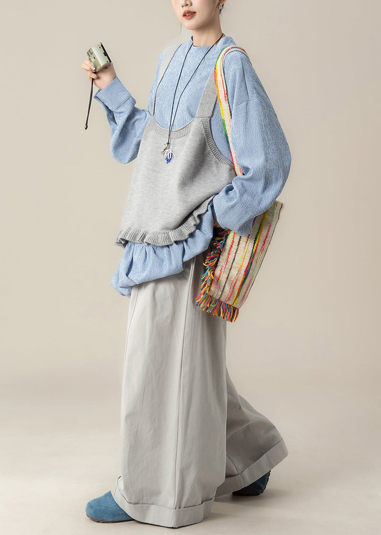 Loose Grey Ruffled Knit Vest Blue Lace Up Tops And Pants Cotton Three Piece Set Fall