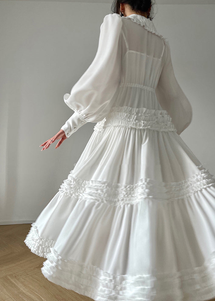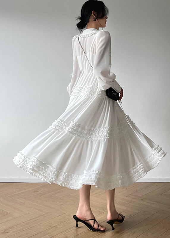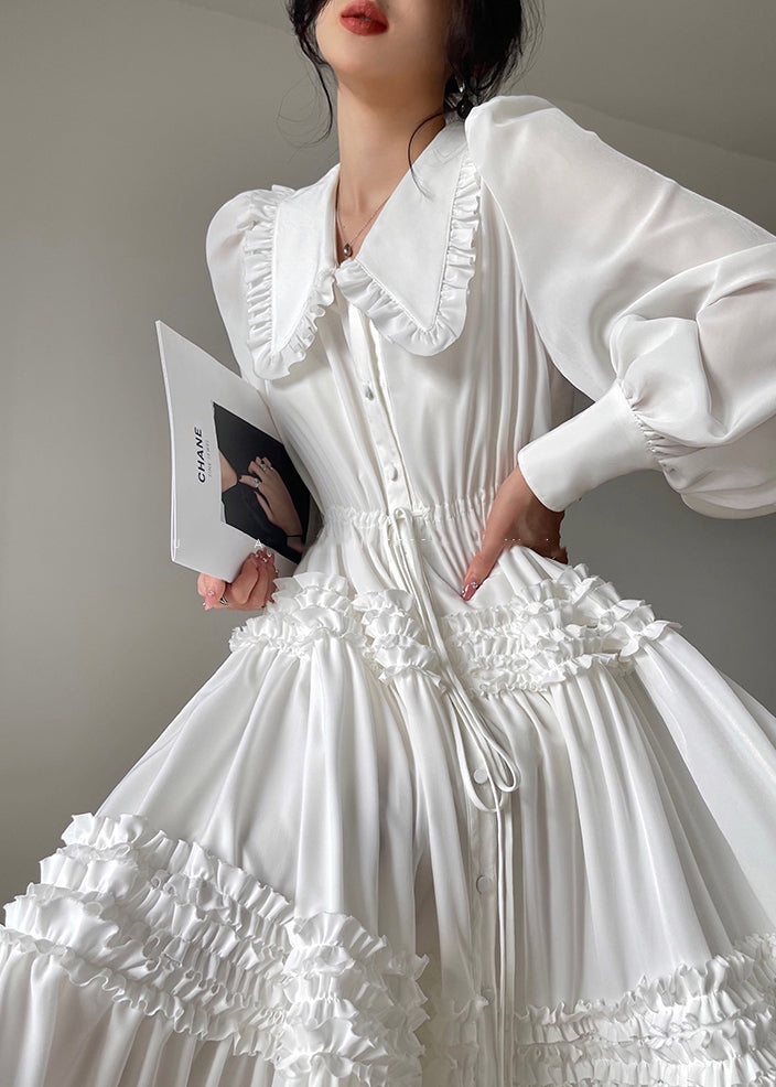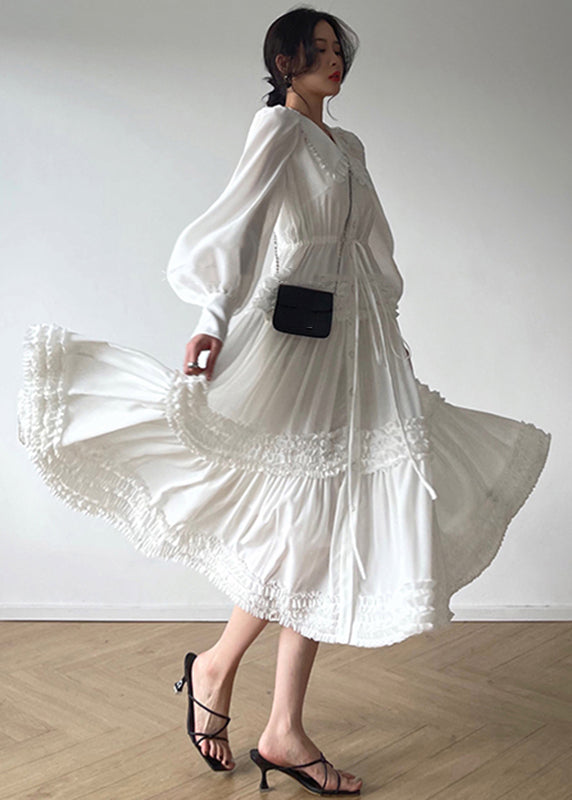 White Print Button Tie Waist Chiffon Dresses Long Sleeve