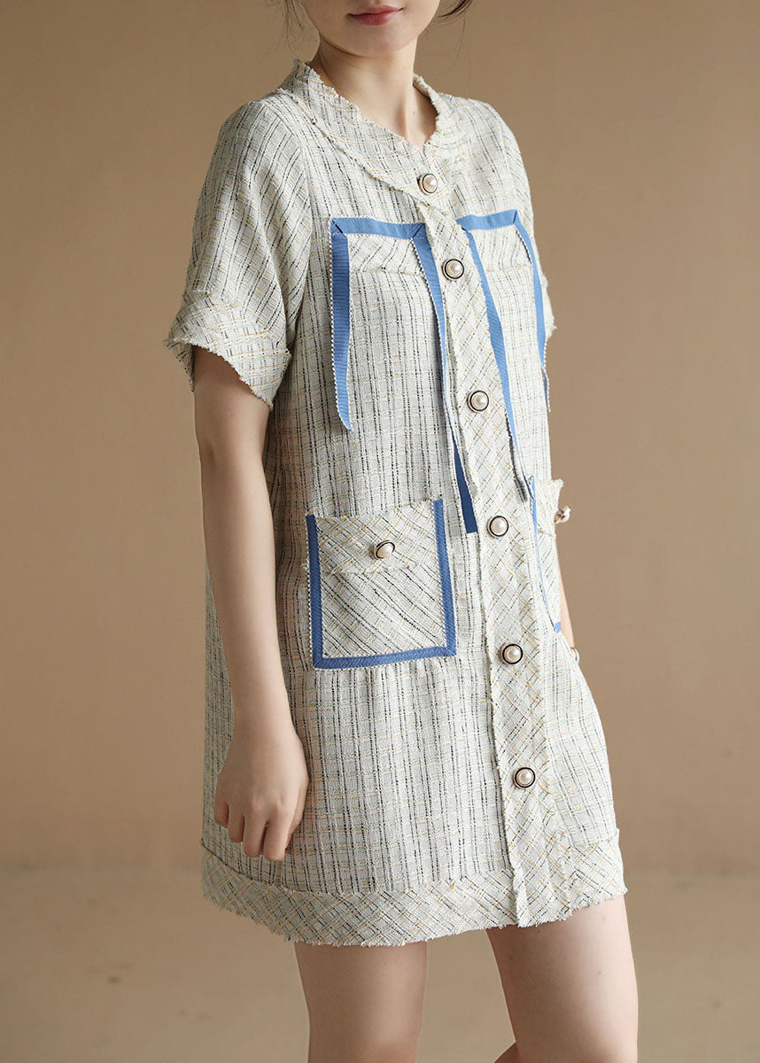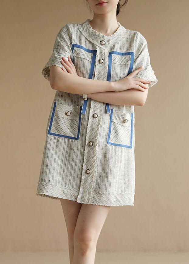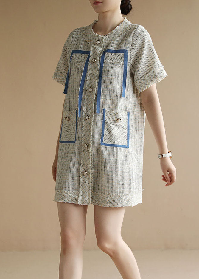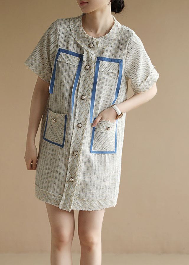 Original Design White O-Neck Plaid Print Button Cotton Dress Short Sleeve