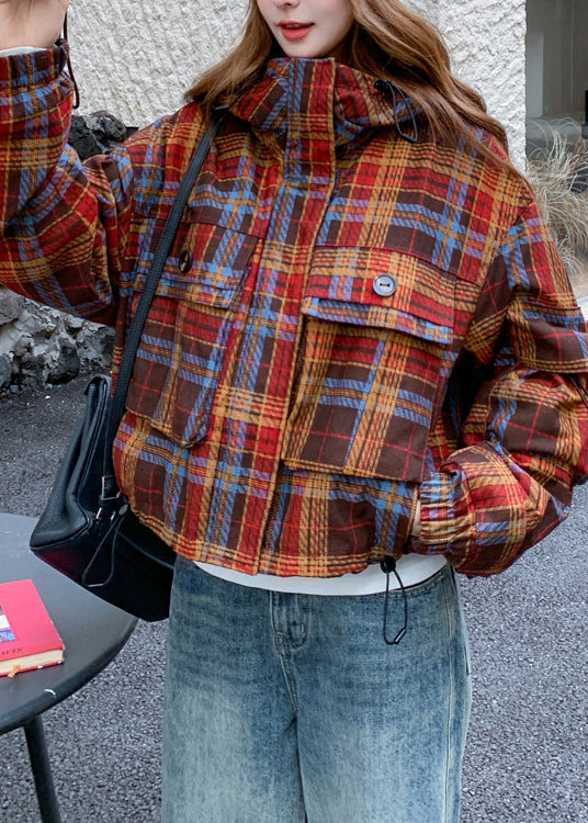 Women Red Hooded Plaid Rabbit Wool Lined Coat Winter