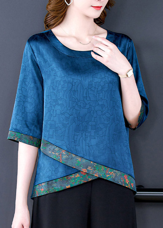 Blue O-Neck Asymmetrical Print Silk Tops Half Sleeve