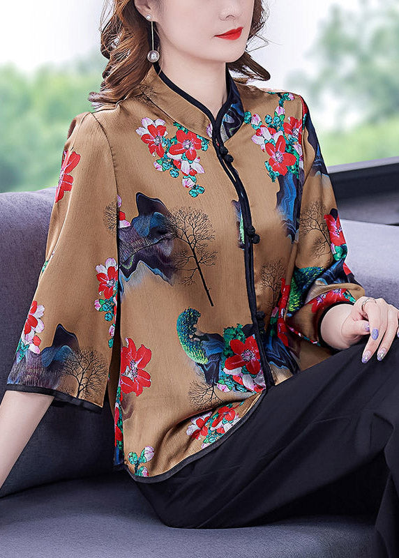 Chinese Style Khaki Stand Collar Print Button Silk Shirts Long Sleeve