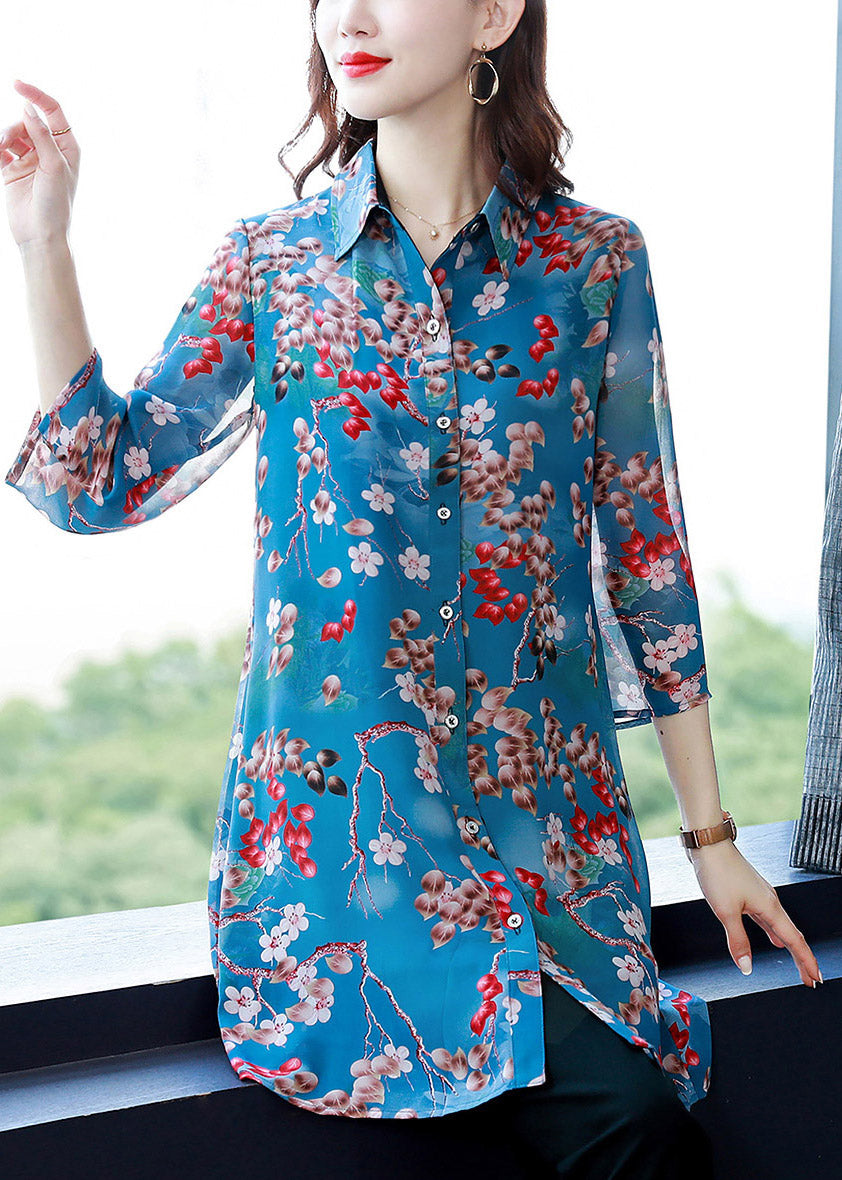 Fitted Blue Peter Pan Collar Print Pockets Chiffon Shirt Long Sleeve