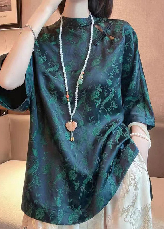 Loose Green Stand Collar Button Silk Tops Half Sleeve