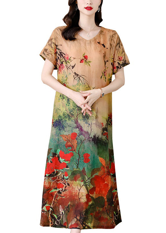 Modern Multi O-Neck Print Linen Dresses Short Sleeve