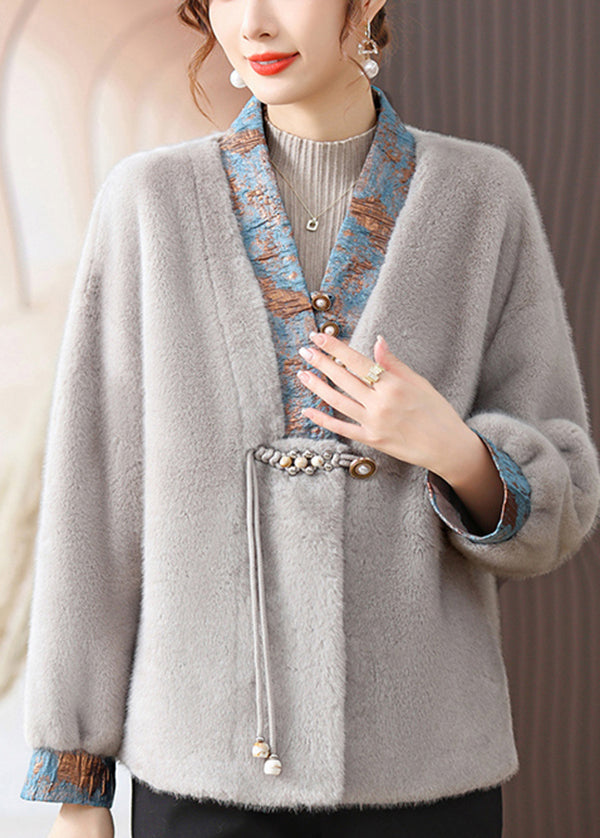 Classy Grey V Neck Tasseled Patchwork Mink Hair Coats Fall