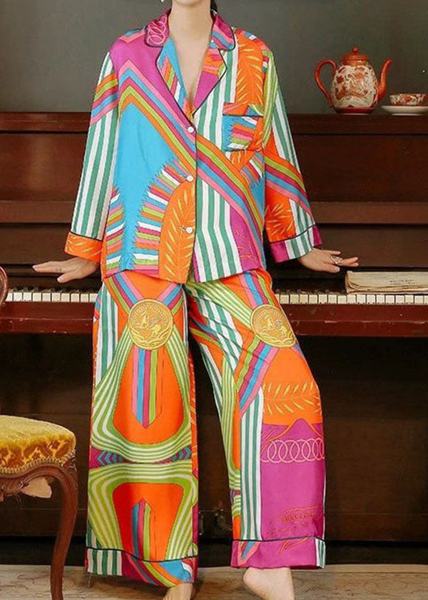 Chic Yellow Peter Pan Collar Striped Print Ice Silk Pajamas Sets Spring