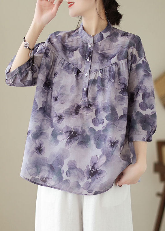 Vintage Purple Stand Collar Print Patchwork Cotton Shirt Tops Summer