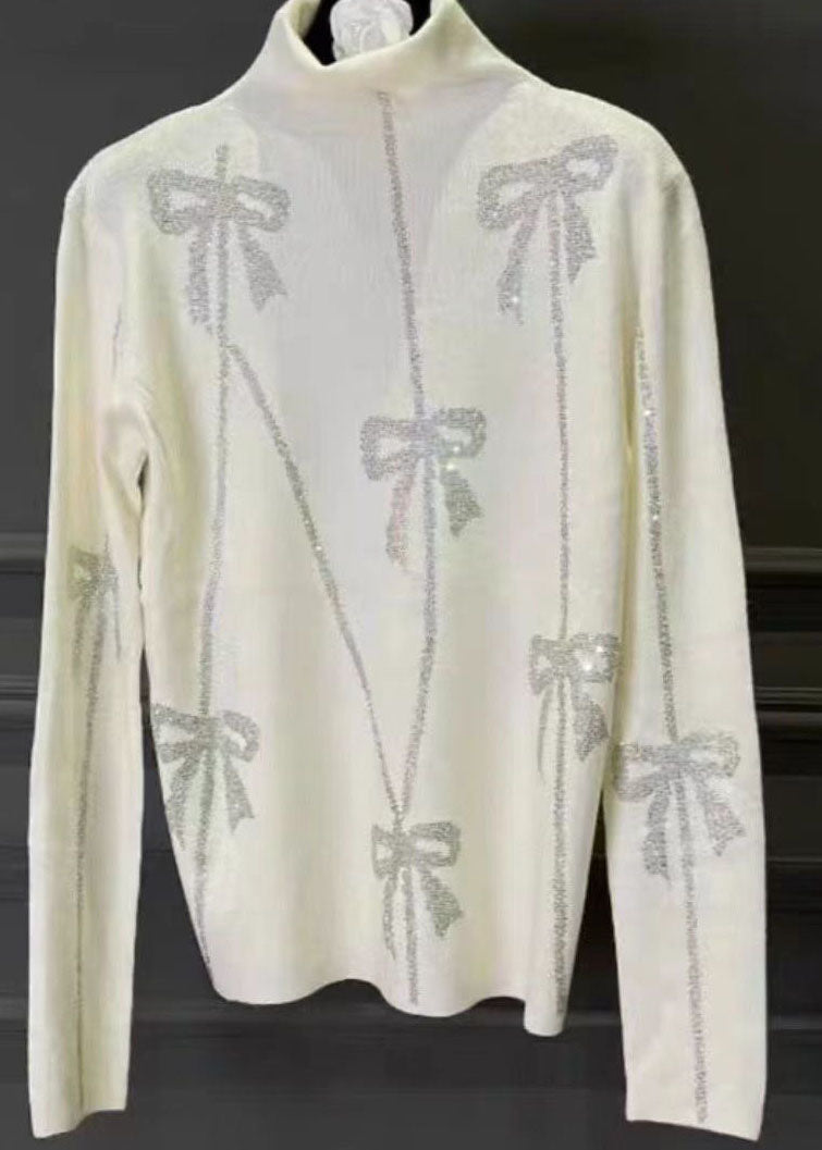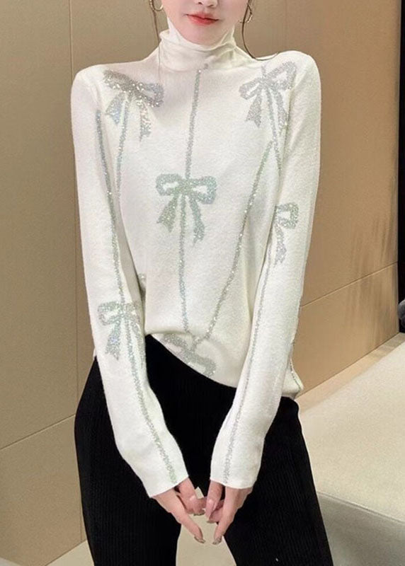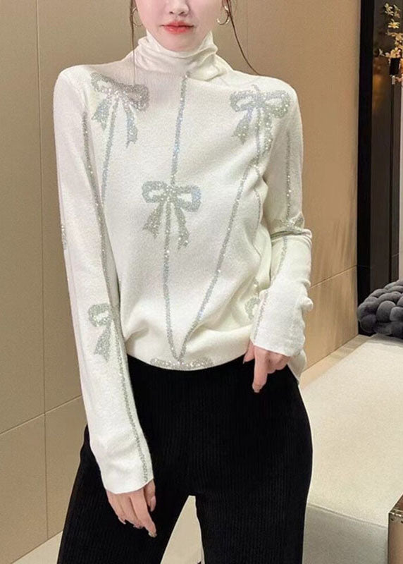 Slim Fit White Turtleneck Zircon Cotton Knit Top Fall