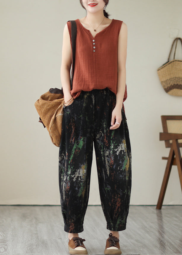 Loose Red Print Pockets Elastic Waist Cotton Filled Pants Winter