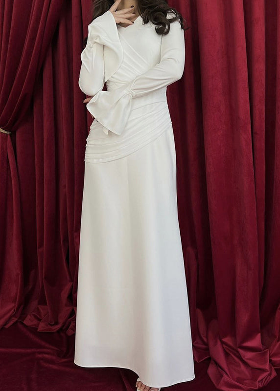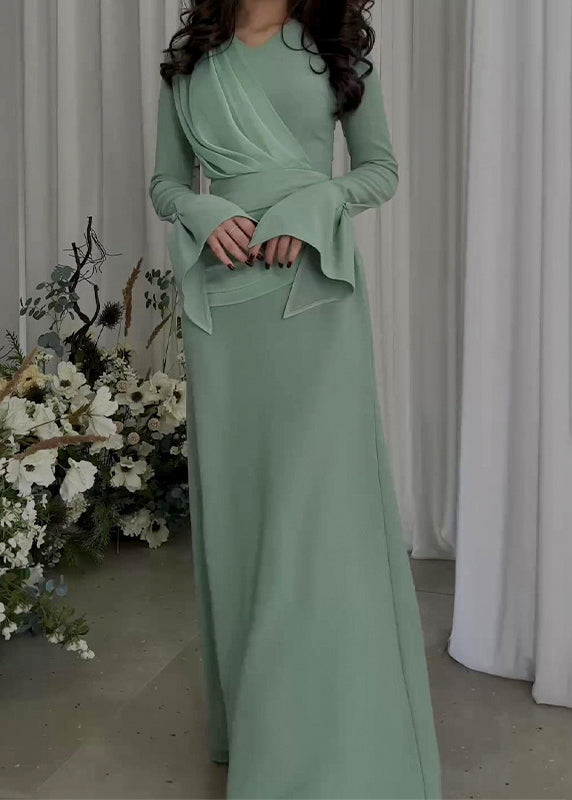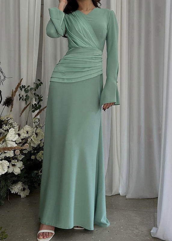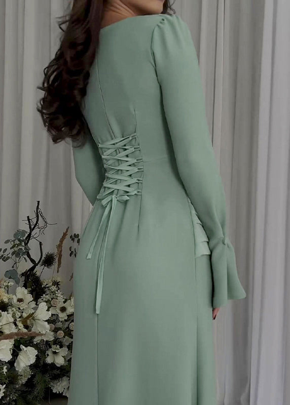 Slim Fit Green Wrinkled Lace Up Cotton Dress Flare Sleeve