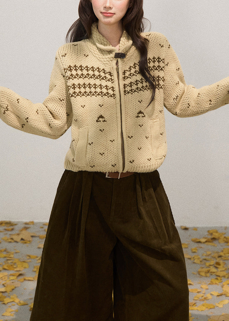 Chic Khaki Stand Collar Zippered Knit Jackets Fall