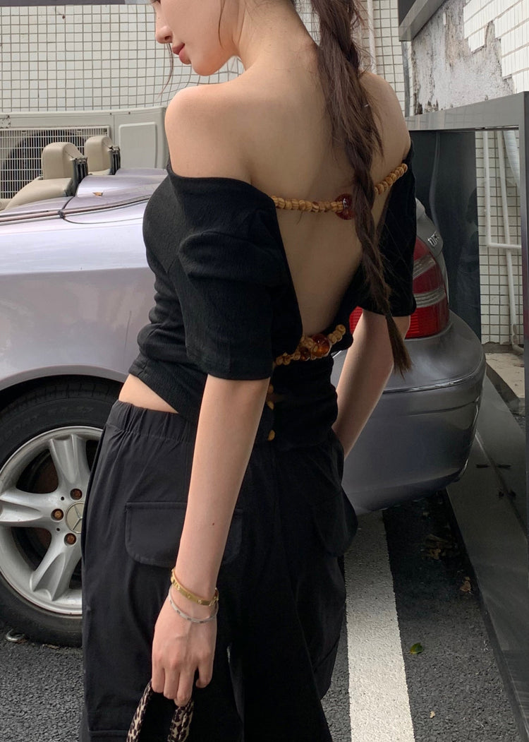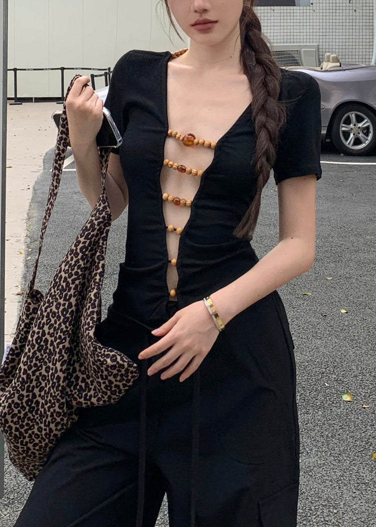 Slim Fit Black V Neck Beading Hollow Out Cotton T Shirts