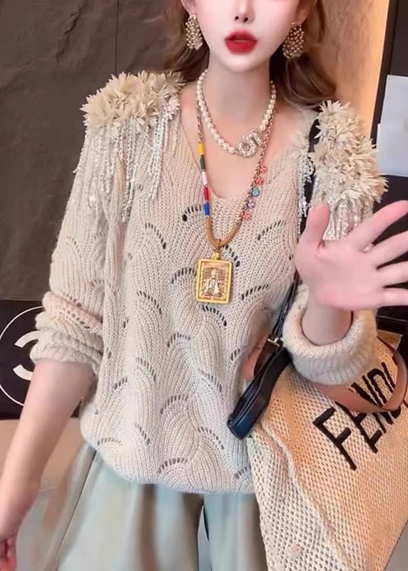 Handmade Pink V Neck Tasseled Hollow Out Knit Sweaters Fall
