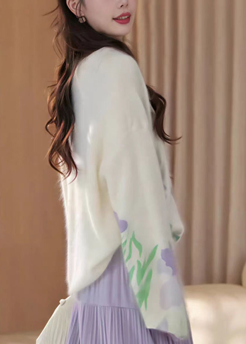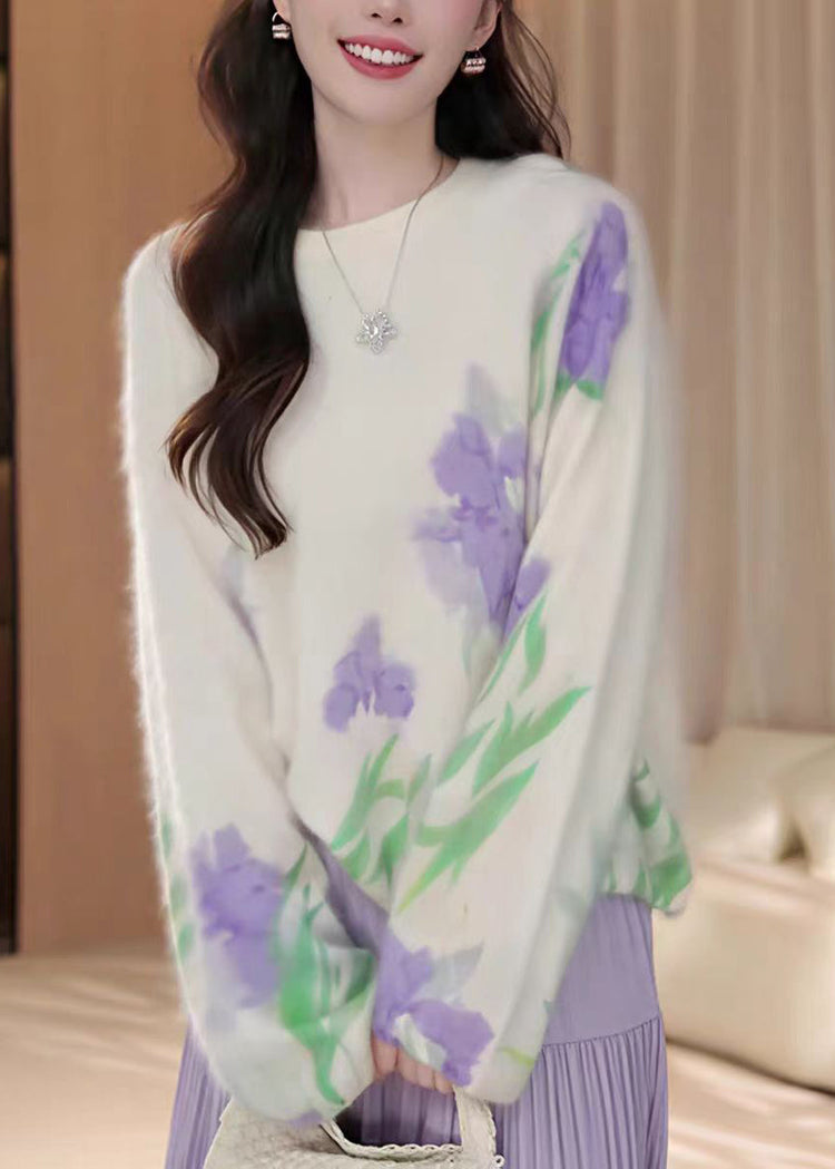 French Beige O Neck Floral Knit Sweater Tops Fall