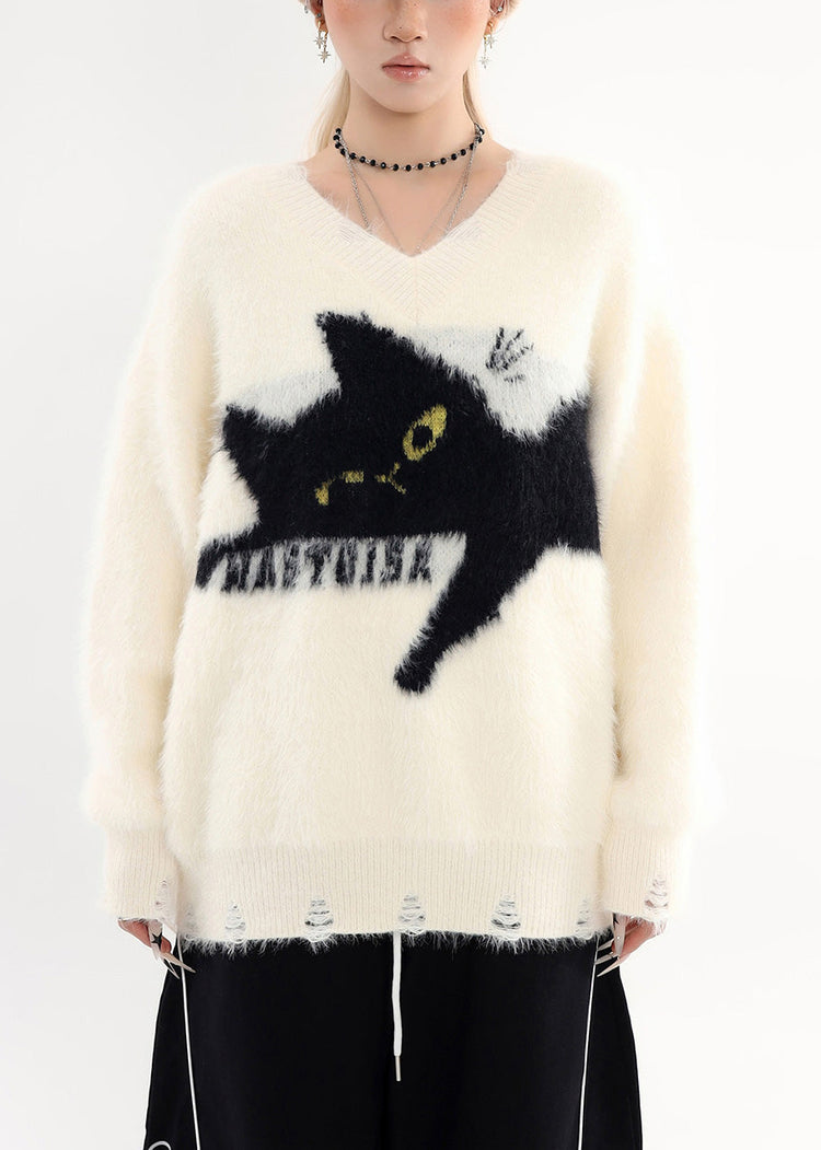 Bohemian White Oversized Cute Cat Cozy Hole Sweater Tops Winter