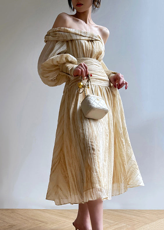 Art Beige Slash Neck Front Open Shirts And Skirts 2 Piece Outfit Lantern Sleeve