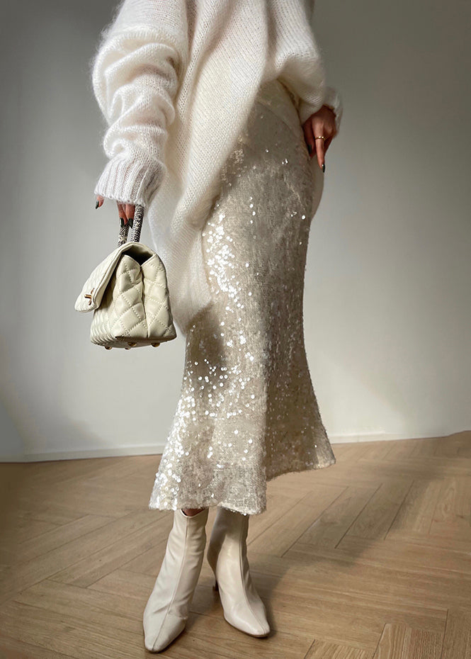 Chic White Sequins High Waist High Waist Fishtail Skirts Spring
