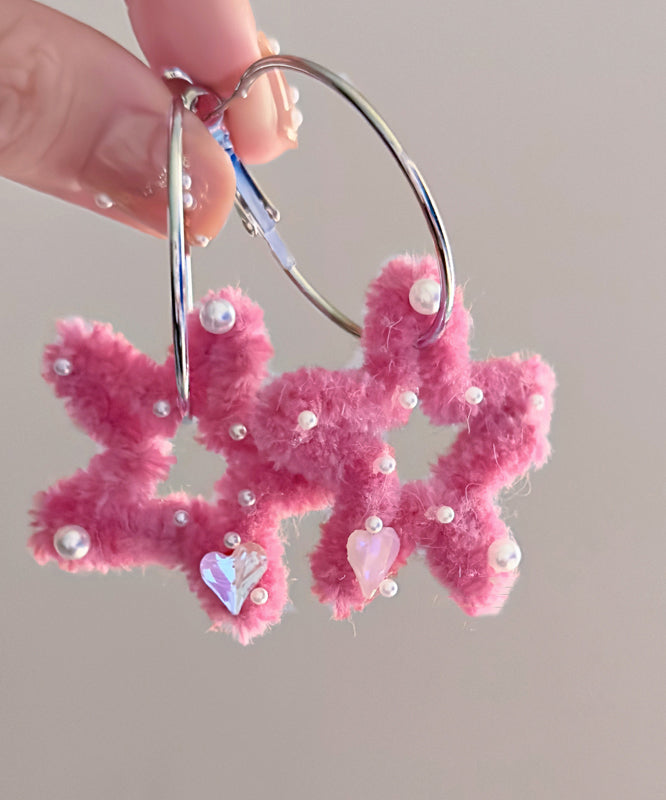 DIY Pink Stainless Steel Fuzzy Fur Fluffy Five-Pointed Star Hoop Earrings