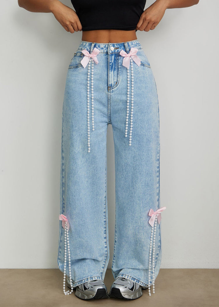 Elegant Blue High Waist Bow Pearl Tassel Wide Leg Jeans