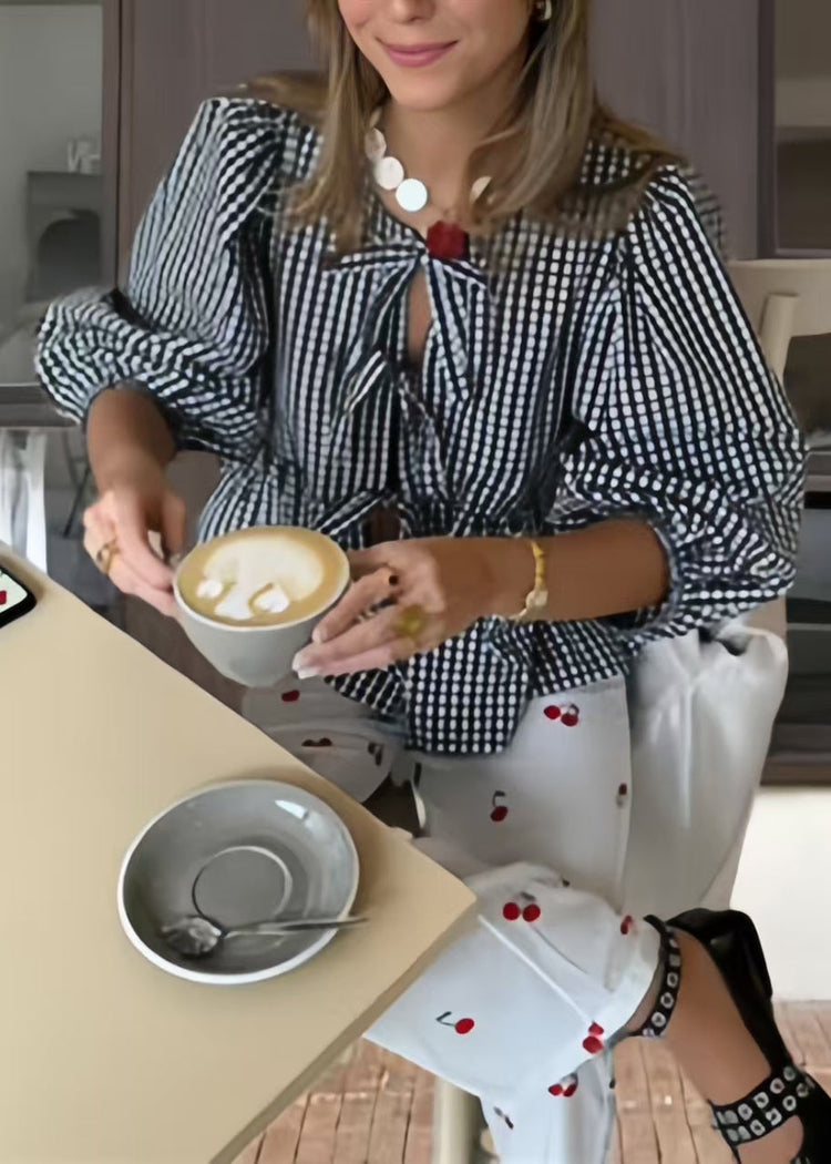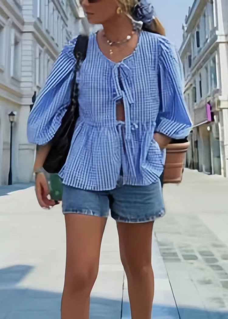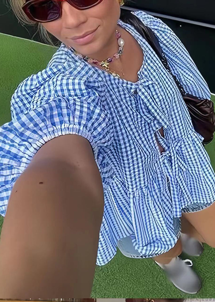 Plus Size Blue Puff Sleeve Plaid Lace Up Cotton Shirts Summer