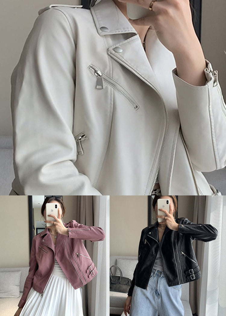 Art Beige Peter Pan Collar Patchwork Faux Leather Jacket Fall