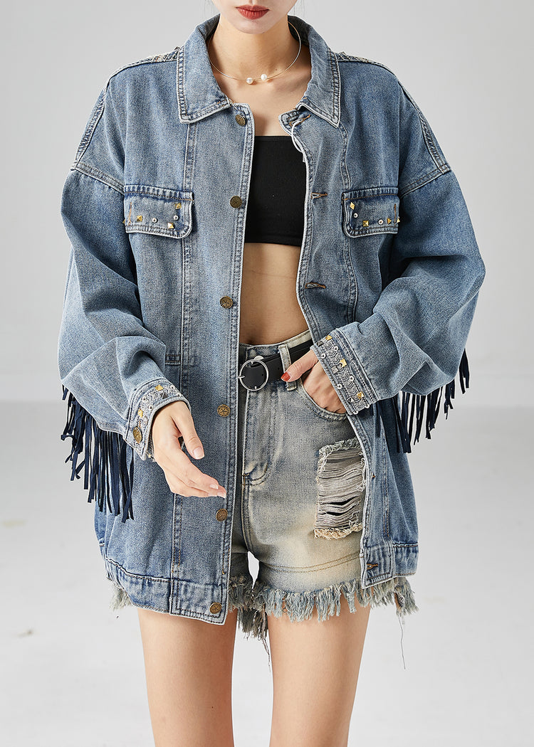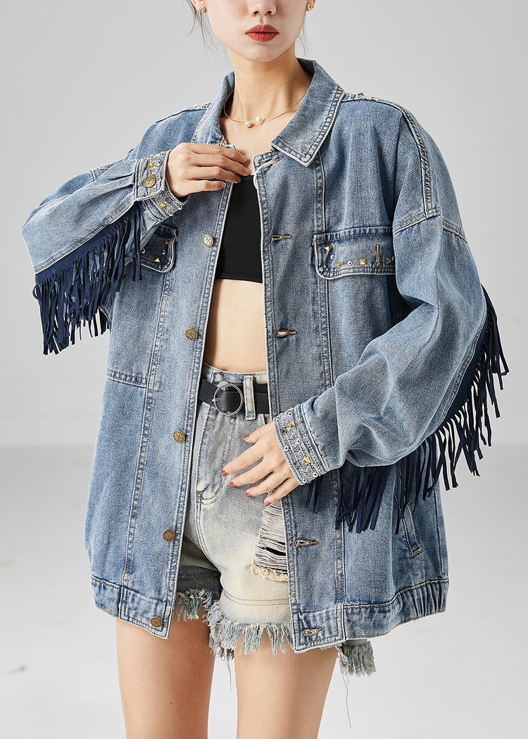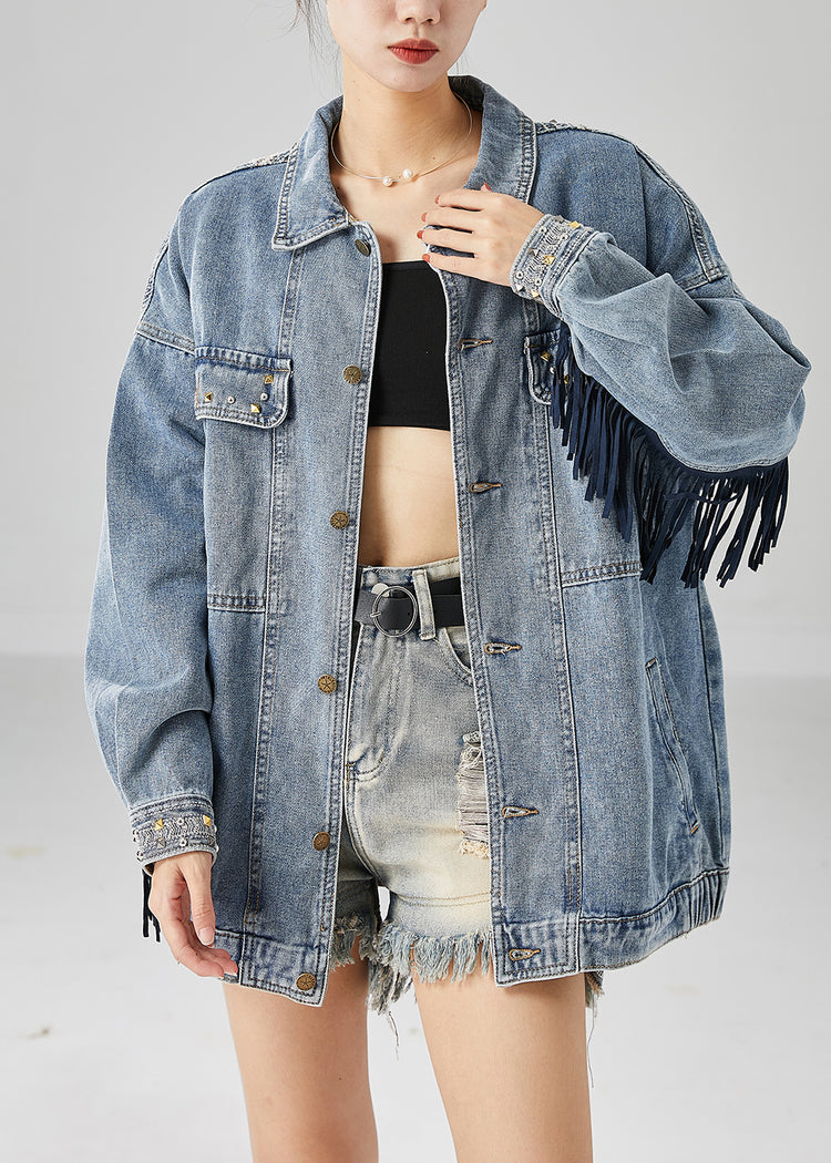 Beautiful Blue Embroidered Patchwork Tasseled Denim Coats Fall