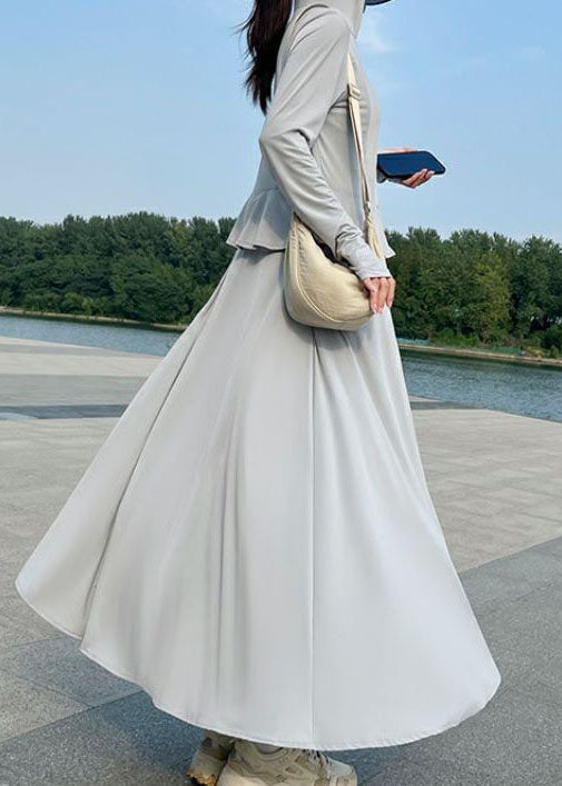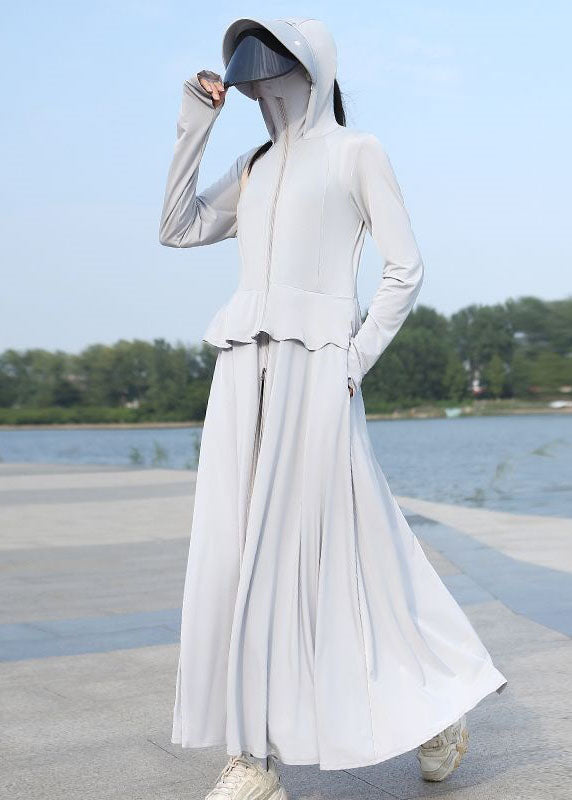 Boutique Grey Hooded Zippered Thin Ice Silk Long UPF 50+ Coat Summer