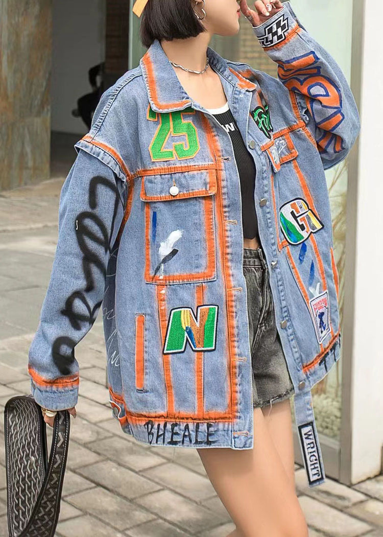 Casual Orange Peter Pan Collar Pockets Graphic Patchwork Denim Coat Spring