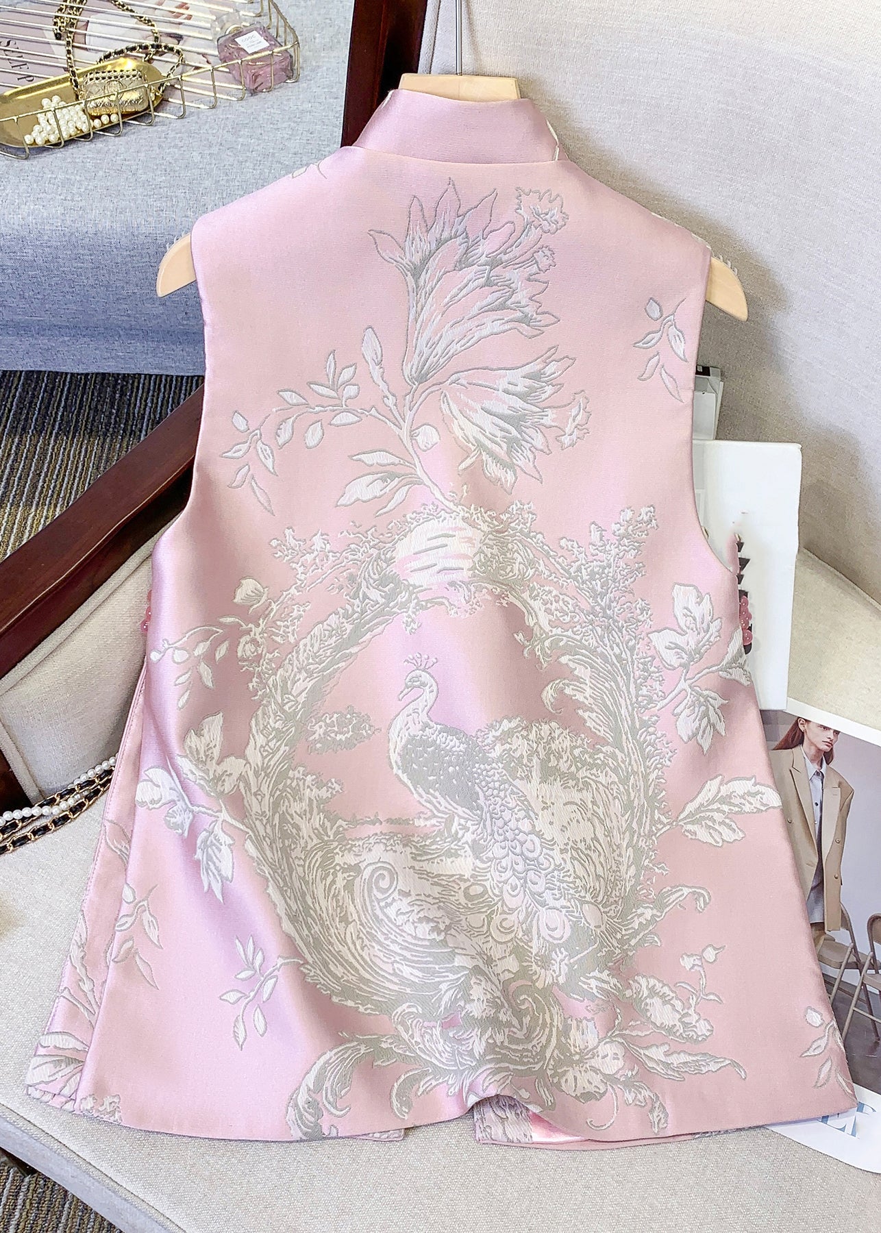 Chinese Style Yellow Stand Collar Print Side Open Waistcoat Spring