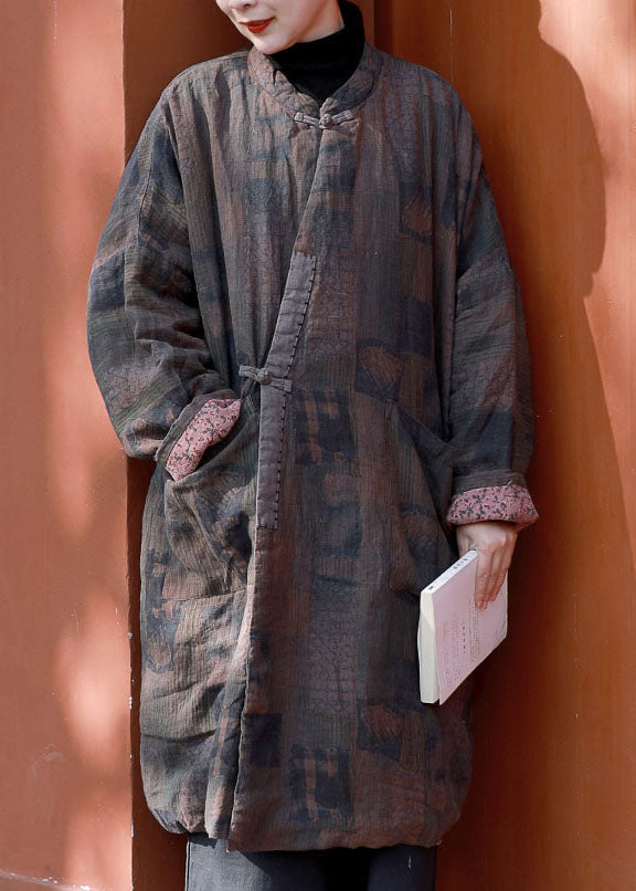 Coffee Patchwork Fine Cotton Filled Coat Pockets Print Winter