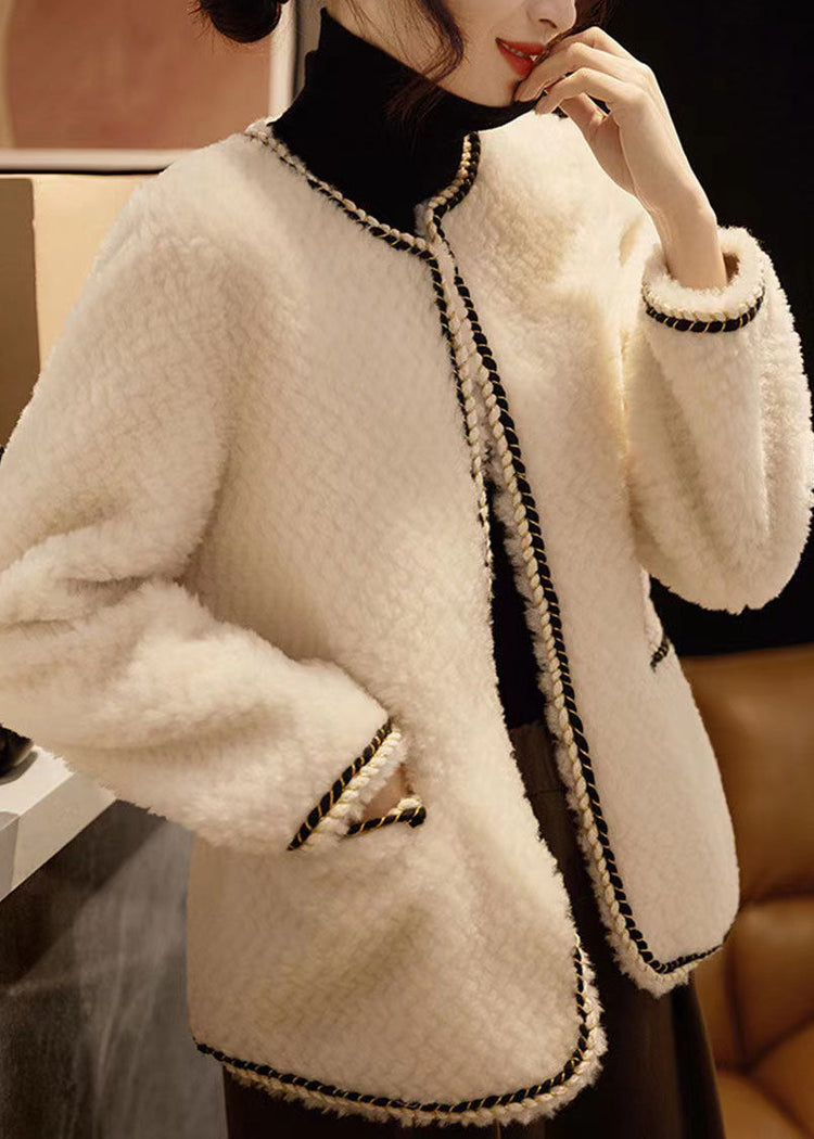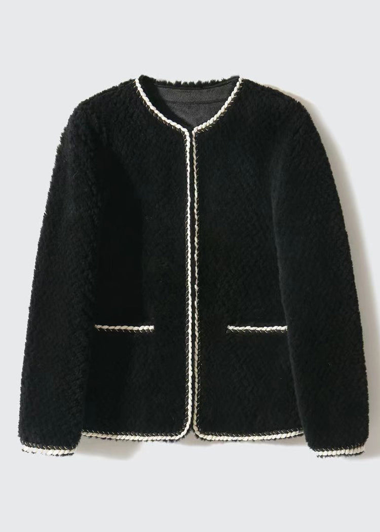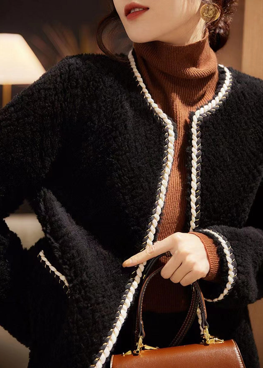 Elegant Black O Neck Pockets Patchwork Wool Coat Winter