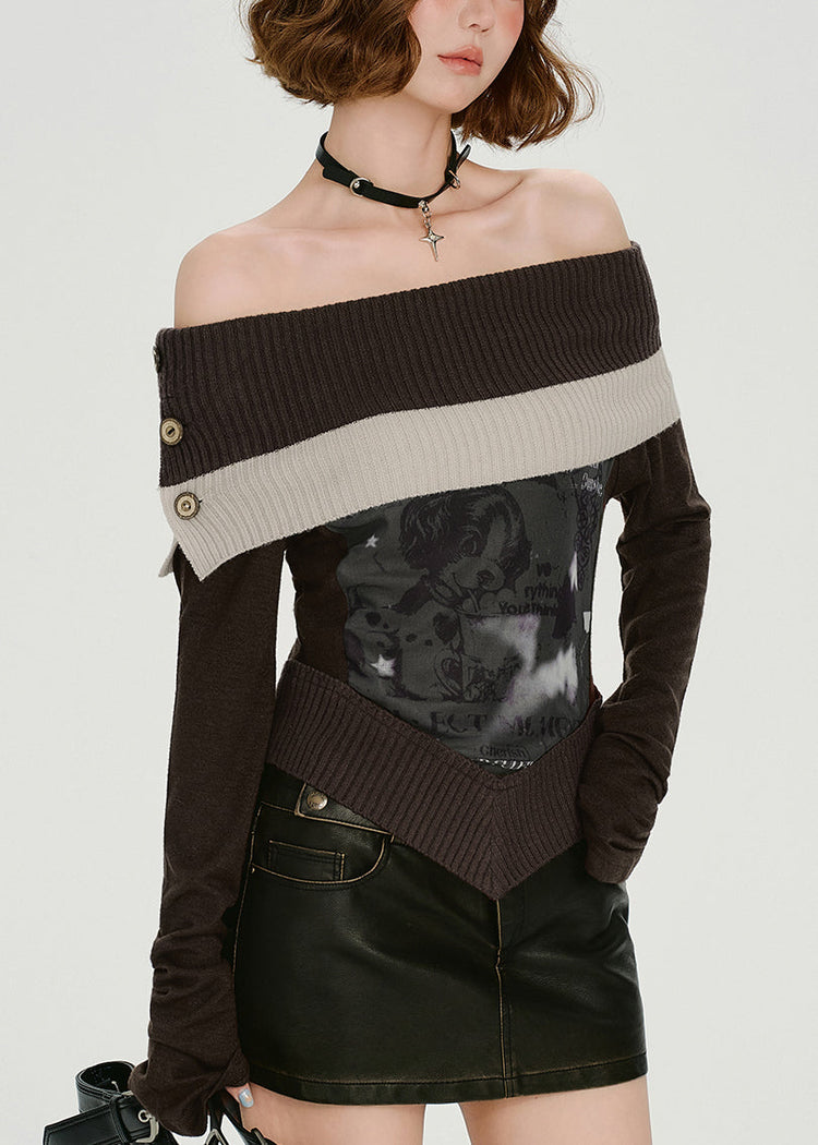 Italian Chocolate Cold Shoulder Patchwork Knit Shirts Spring