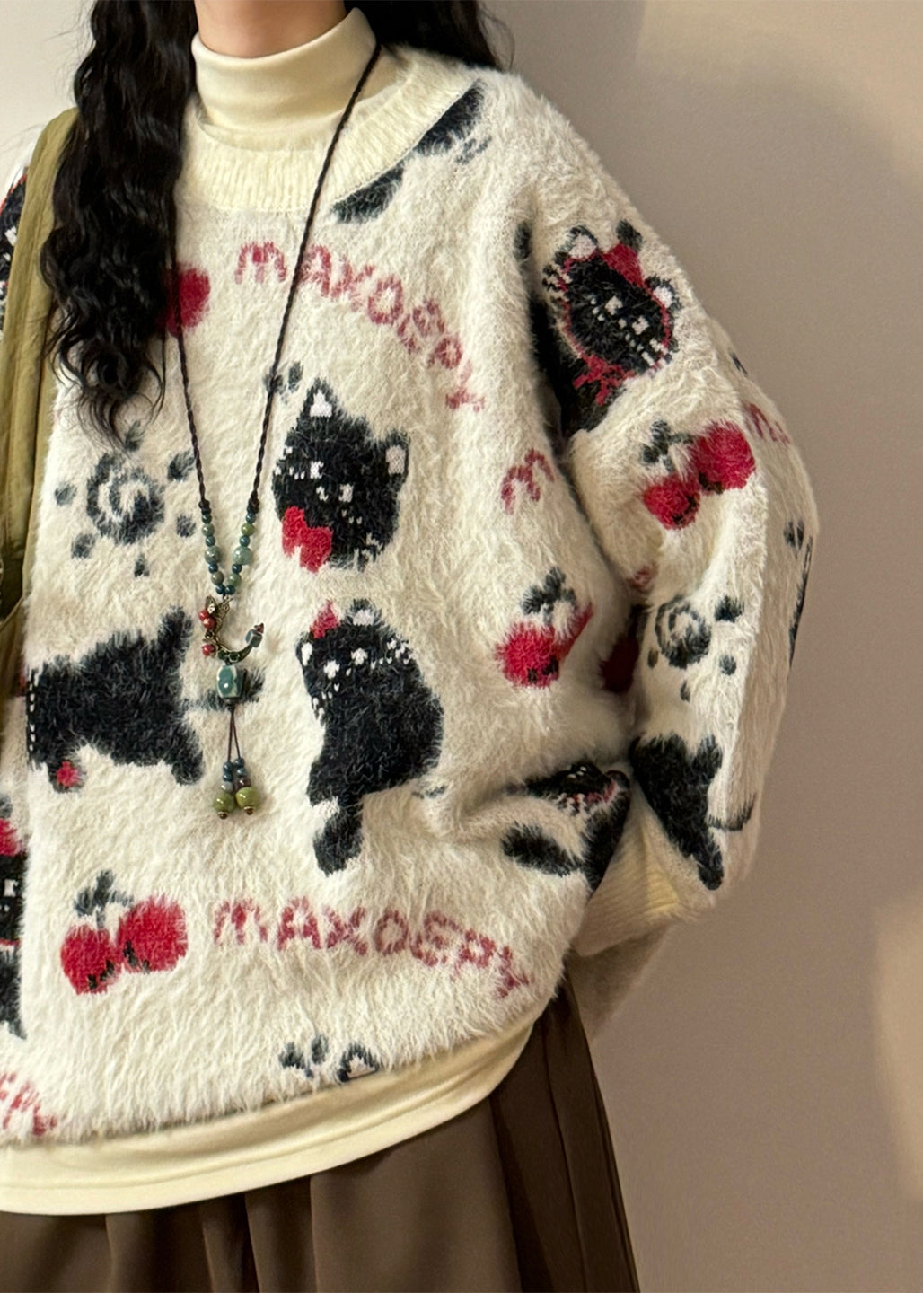 Loose Apricot Jacquard Kitten Cherry Knit Sweater Winter