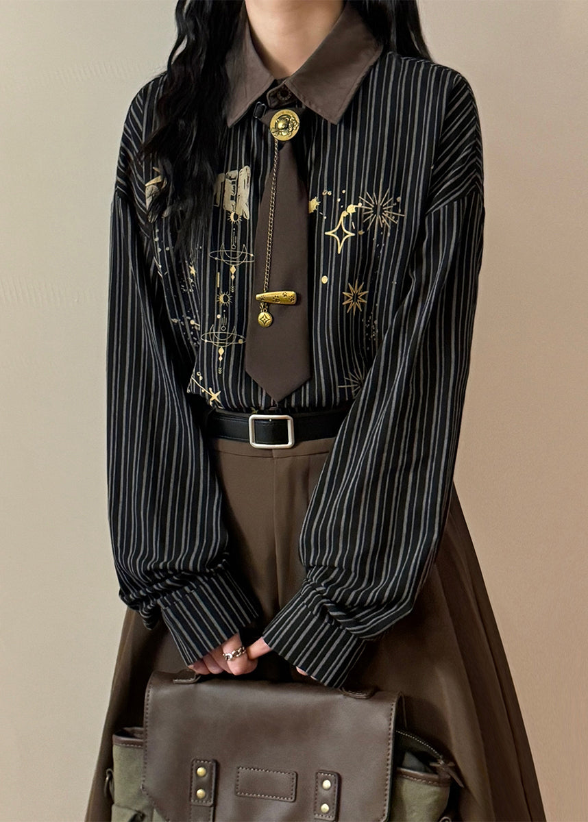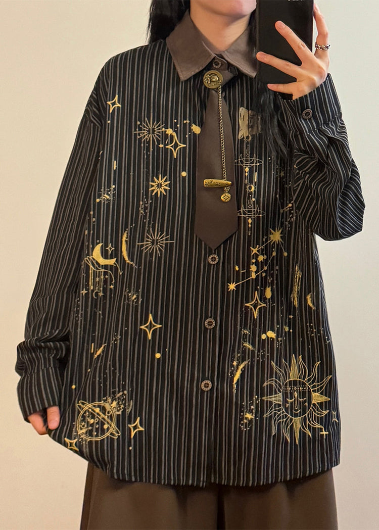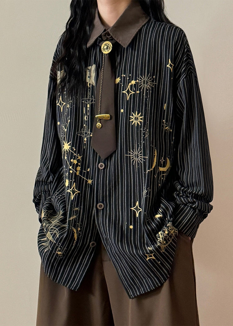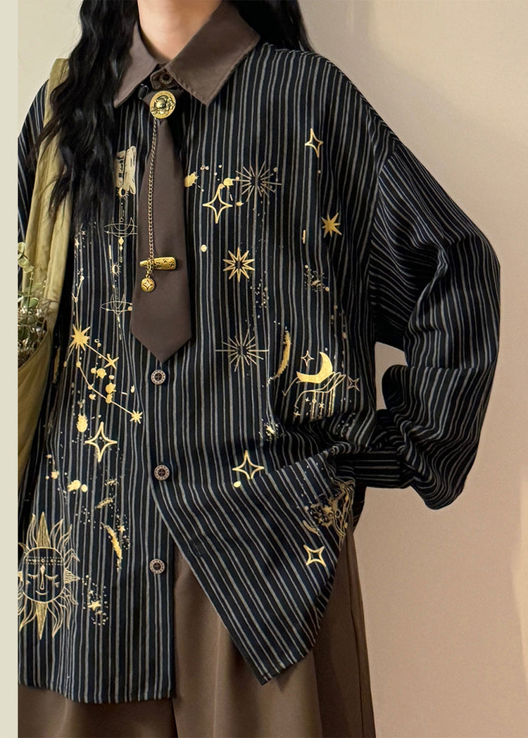 Striped Black Peter Pan Collar Print Button Cotton Blouse Spring